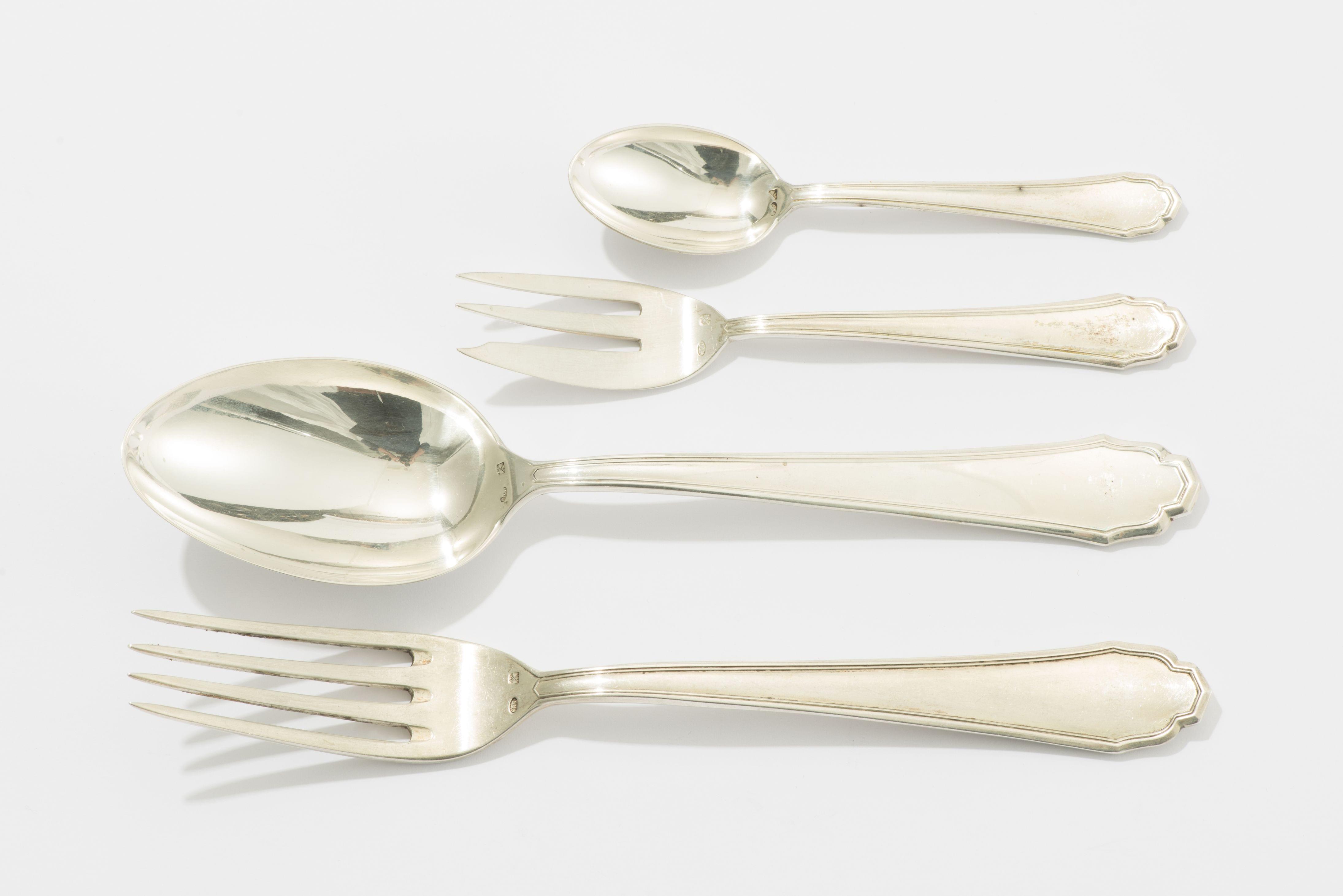 Genève, Boujon Frères, argent 800 et bakélite imitant l'ivoire, comprenant: 12 fourchettes, 12 cuillères et 12 couteaux de table, 12 couteaux à entremets, 16 fourchettes à pâtisserie, 6 cuillères à sorbet, 12 à thé, 12 à café, 20 pièces de service, 3940 g (114p)