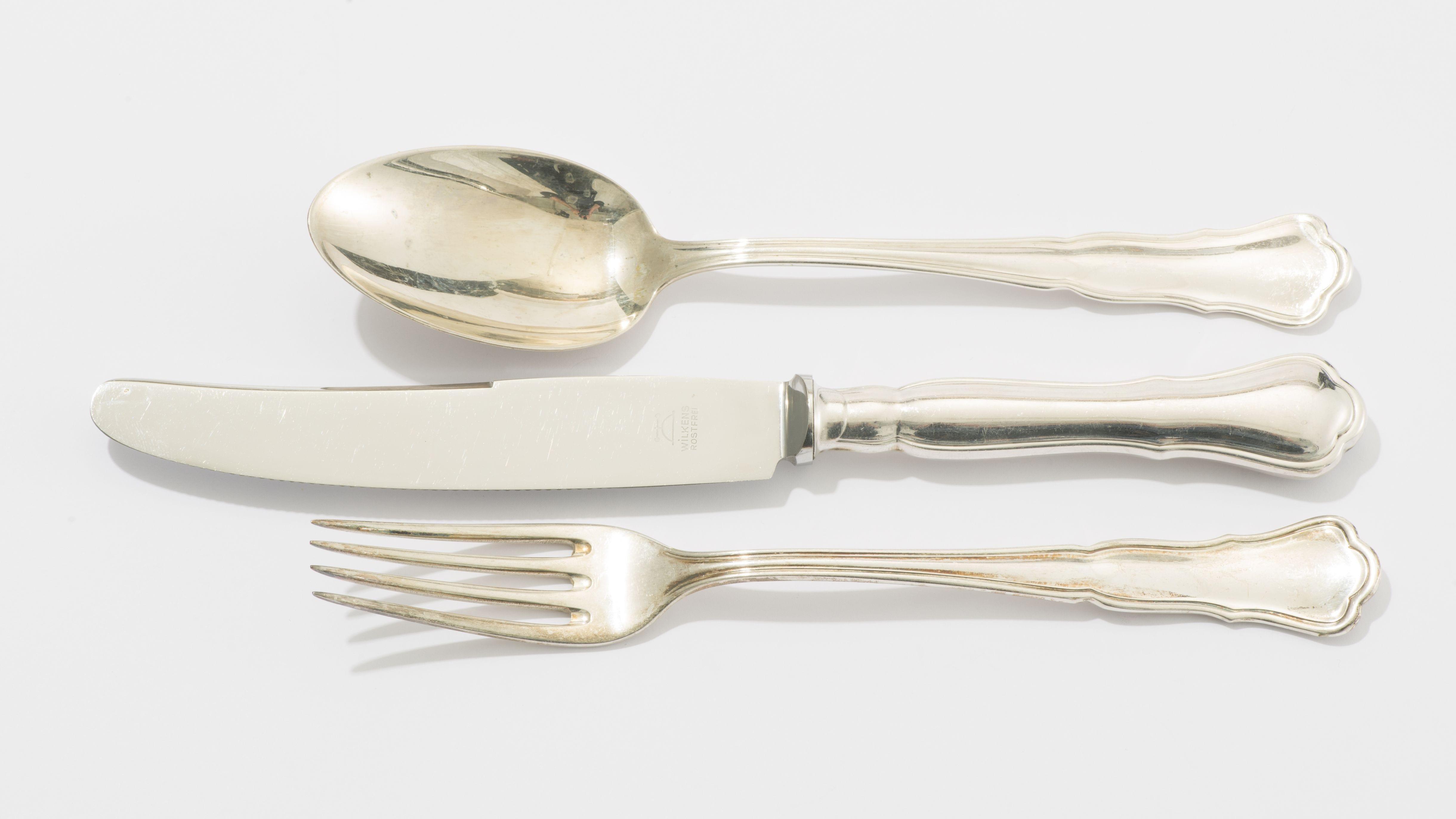 Allemagne, Wilkens, argent 800, comprenant: 16 fourchettes, 6 cuillères et 16 couteaux à dîner, 16 fourchettes, 14 cuillères et 16 couteaux à entremets, 16 fourchettes et 16 couteaux à poisson, 14 fourchettes, 16 cuillères et 14 couteaux à dessert, 16 fourchettes à pâtisserie, 16 cuillères à thé et 8 à café, 25 pièces de service, 6640g (225p)