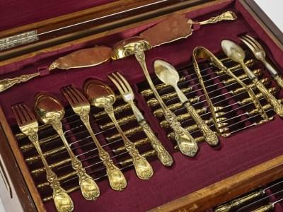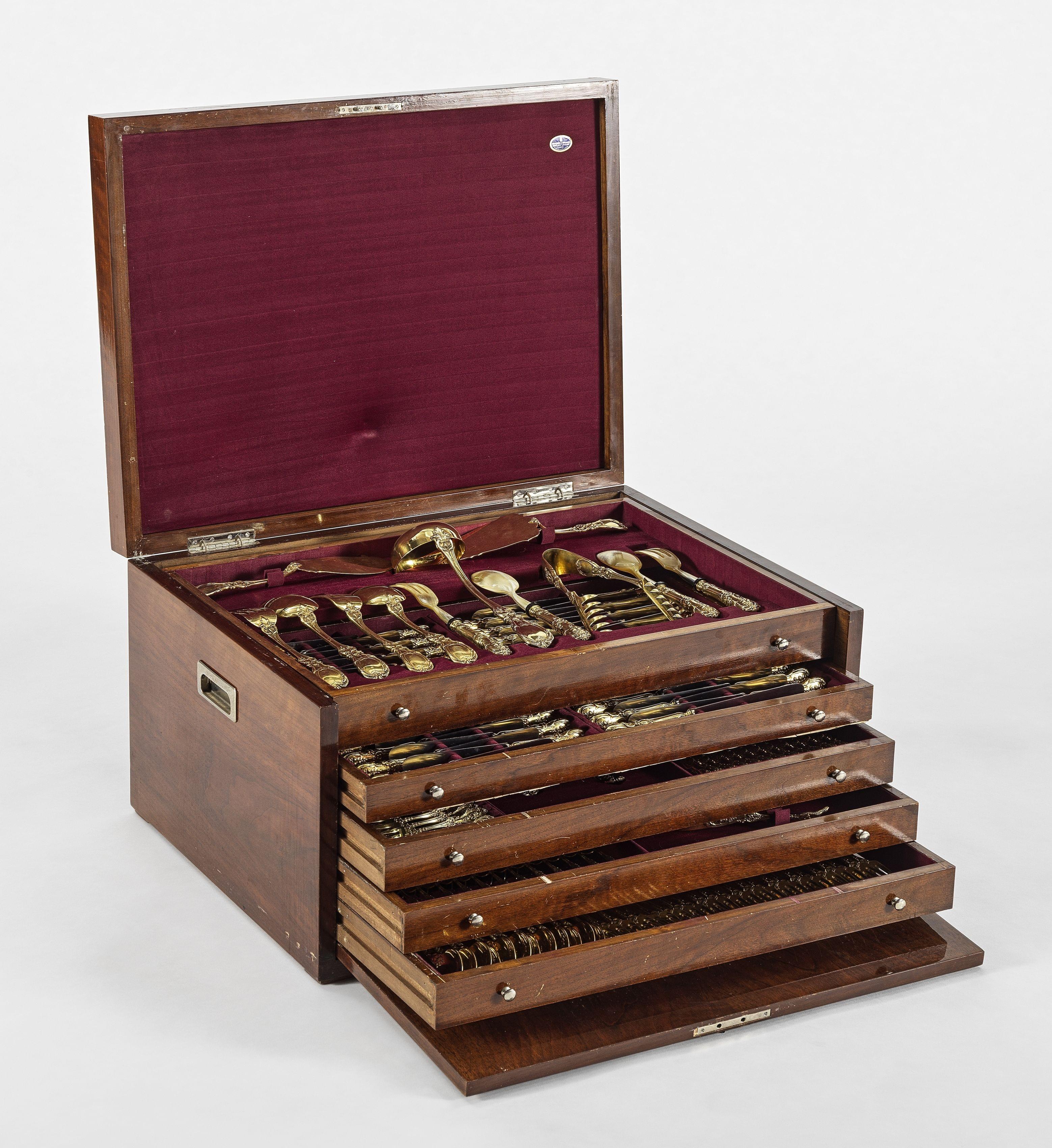 Italie, vermeil 925, comprenant: 24 fourchettes, 12 cuillères et 24 couteaux à dîner, 24 fourchettes, 12 cuillères et 24 couteaux à entremêt, 12 fourchettes et 12 couteaux à poisson, 12 cuillères à thé, 12 cuillères à café et 20 pièces de service, 10700 g