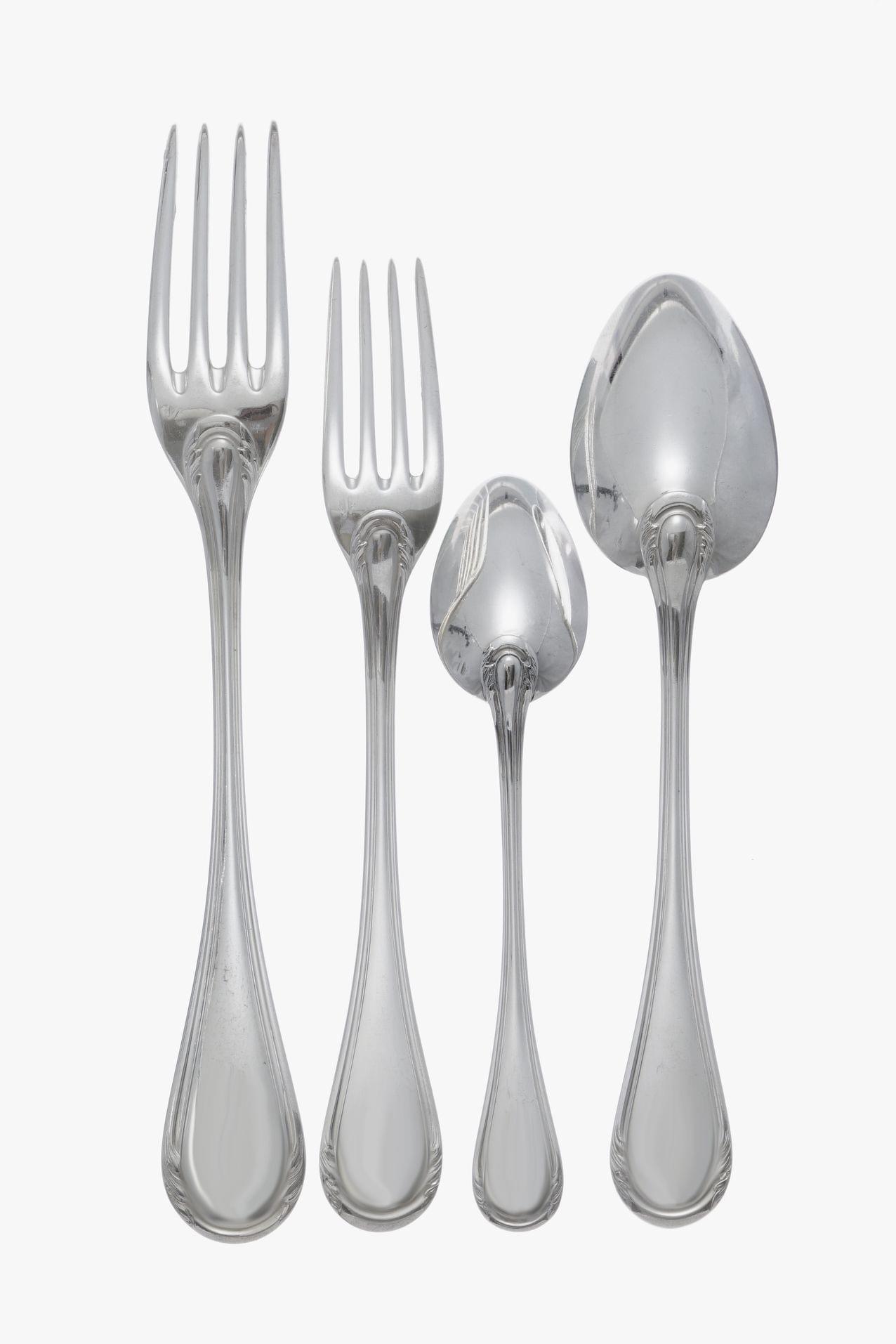 Olier & Caron, France, argent, comprenant: 12 fourchettes et 12 cuillères à dîner, 12 fourchettes et 12 cuillères à entremets, 12 fourchettes et 12 couteaux à poisson, 12 cuillères à thé, 12 à glace, 6 pièces de service, 5800g. On joint 12 couteaux de table et 12 à entremets assortis (126p)