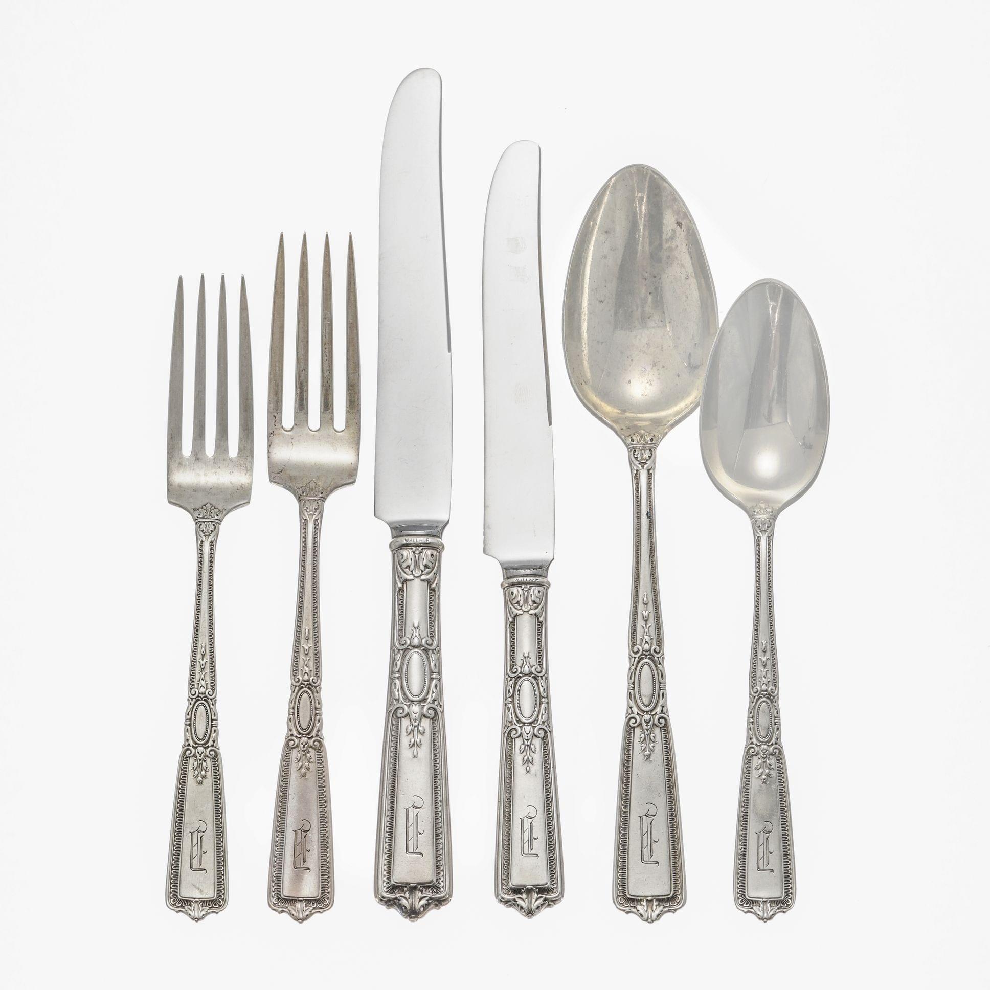 Wallace, USA, comprenant: 15 fourchettes et 12 couteaux à dîner, 12 fourchettes et 12 couteaux à entremets, 8 cuillères à dessert, 12 cuillères à thé, 4 cuillères de service, 2370g