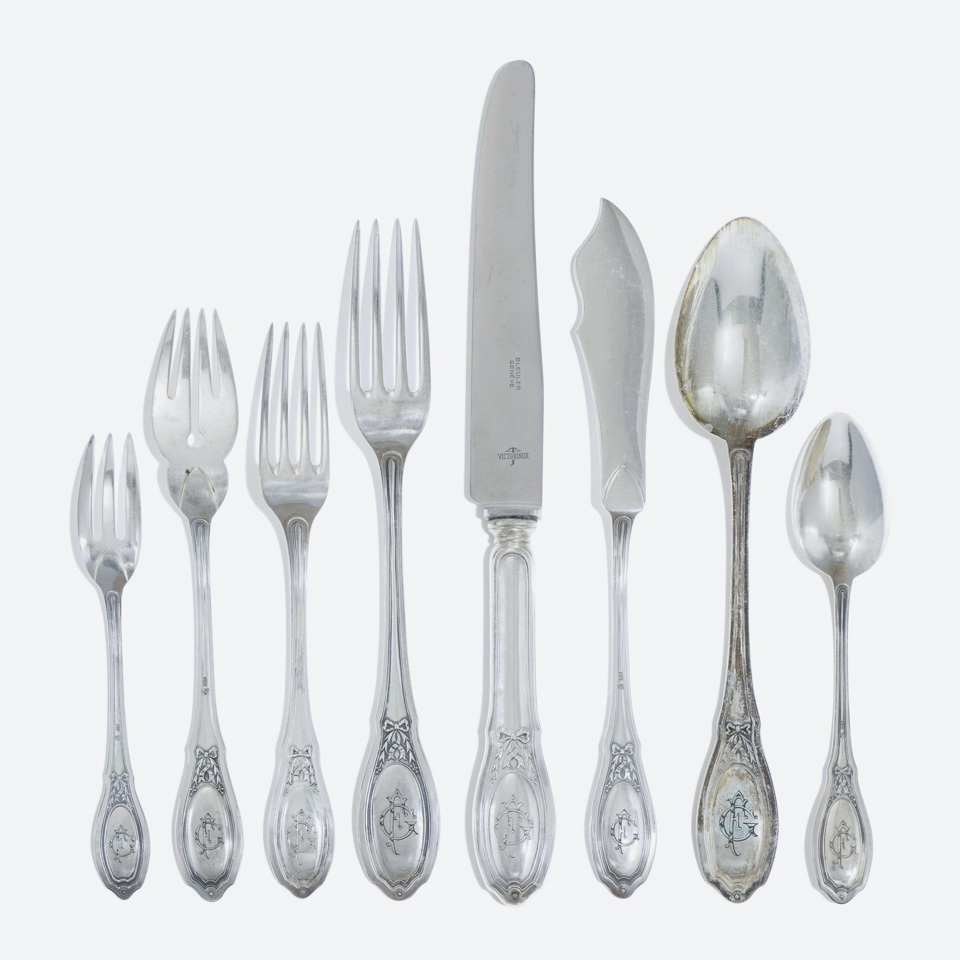 Jezler, argent 800, comprenant: 24 fourchettes, 18 cuillères et 18 couteaux à dîner, 18 fourchettes et 18 couteaux à poisson, 18 fourchettes et 12 couteaux à entremets, 18 fourchettes à pâtisserie et 18 cuillères à thé, 6000 g (162p)