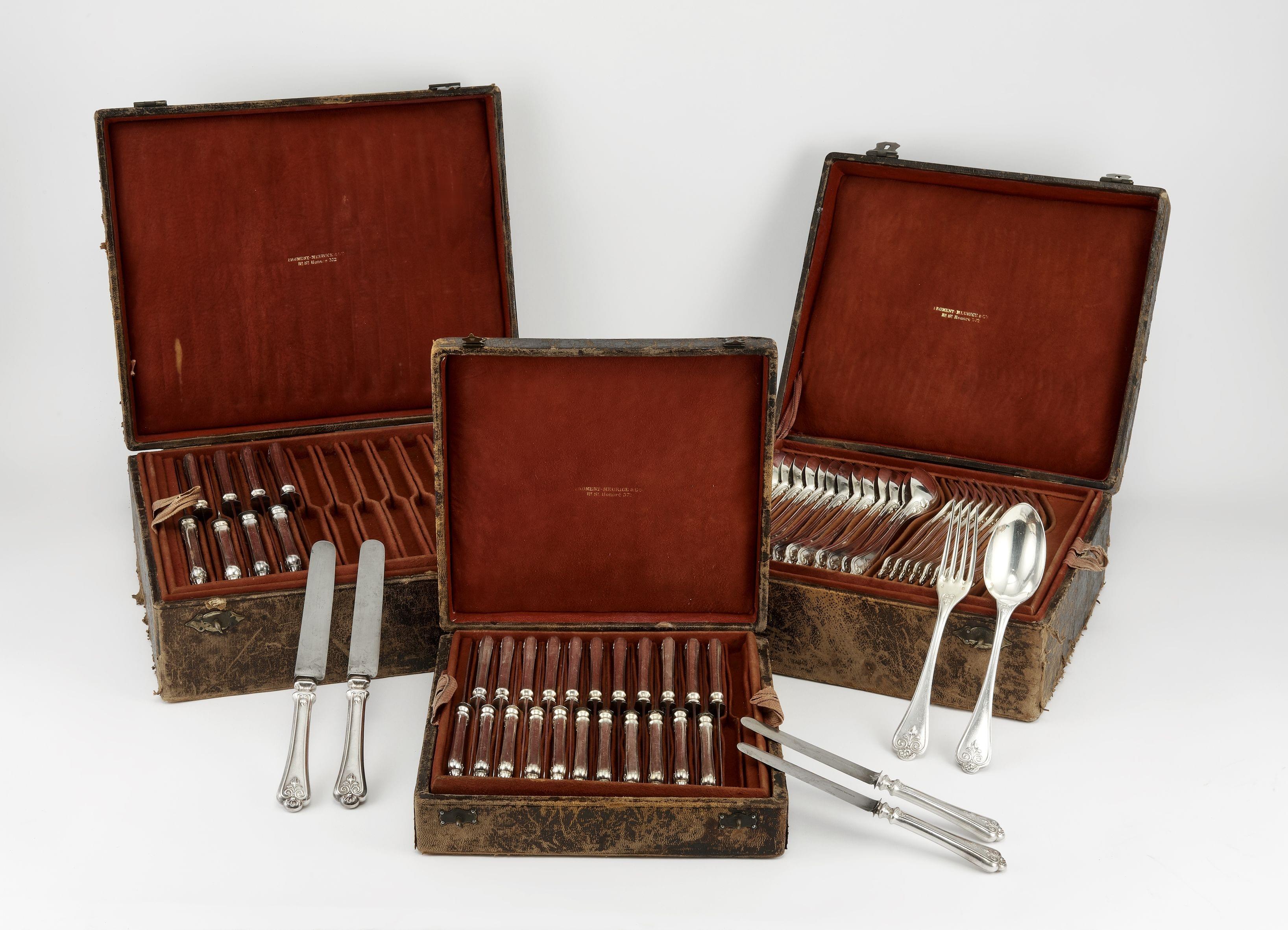 France, Pierre Quielle pour Froment Meurice, argent, comprenant: 22 fourchettes, 36 cuillères, 12 couteaux et 6 pièces de service, 5700 g
