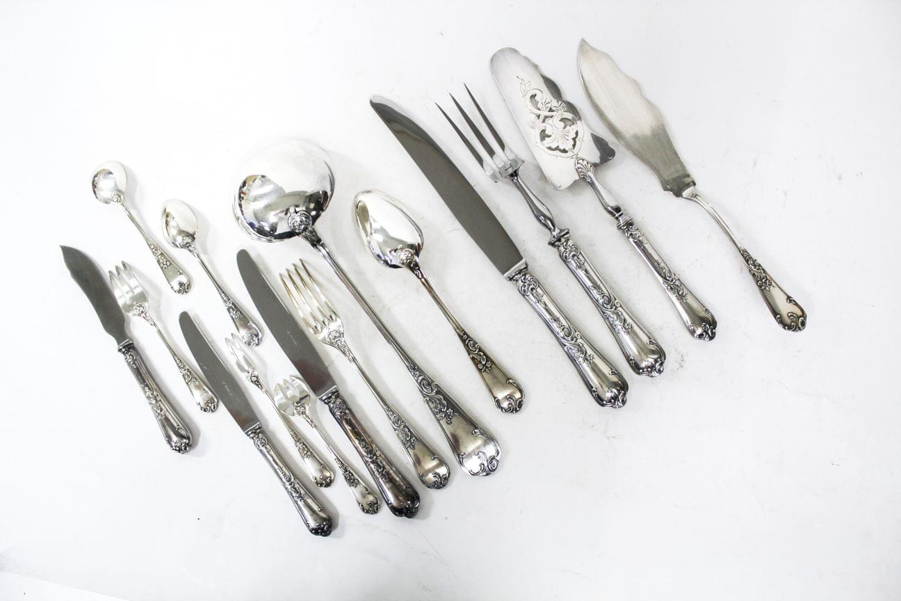 Métal argenté, comprenant: 12 fourchettes, 12 cuillères et 12 couteaux de table, 12 fourchettes et 12 couteaux à poisson, 12 fourchettes à fruits de mer, 12 fourchettes à huîtres, 11 fourchettes à pâtisserie, 12 couteaux à entremets, 12 cuillères à thé, 12 à glace et 14 pièces de service (145p)