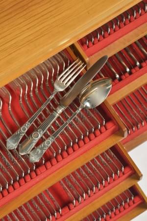 Jezler, argent 800, comprenant : 24 fourchettes, 24 couteaux et 24 cuillères de table, 24 fourchettes, 24 couteaux et 24 cuillères à entremets, 24 fourchettes et 24 couteaux à poisson, 24 fourchettes à pâtisserie, 24 fourchettes et 24 couteaux à fruits, 31 pièces de service, 10'000g (295p)