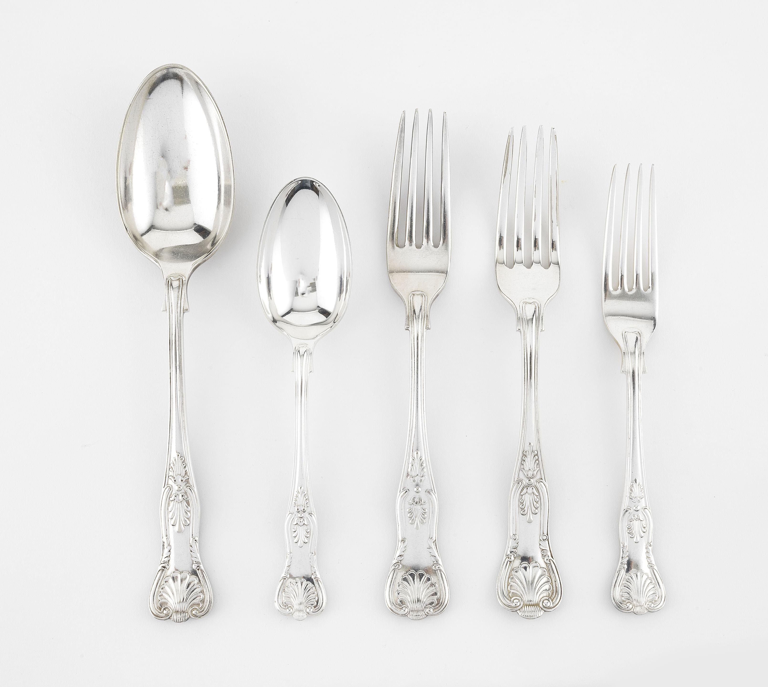 Mappin & Webb, métal argenté, comprenant: 18 fourchettes et 18 cuillères à dîner, 18 fourchettes à entremets, 18 cuillères à thé, 3 pièces de service (75p). On joint des couverts d'un modèle quasiment similaire par Gorham: 10 fourchettes et 10 cuillères à dîner, 6 fourchettes et 6 cuillères à entremets, 10 cuillères à thé (42 p).
