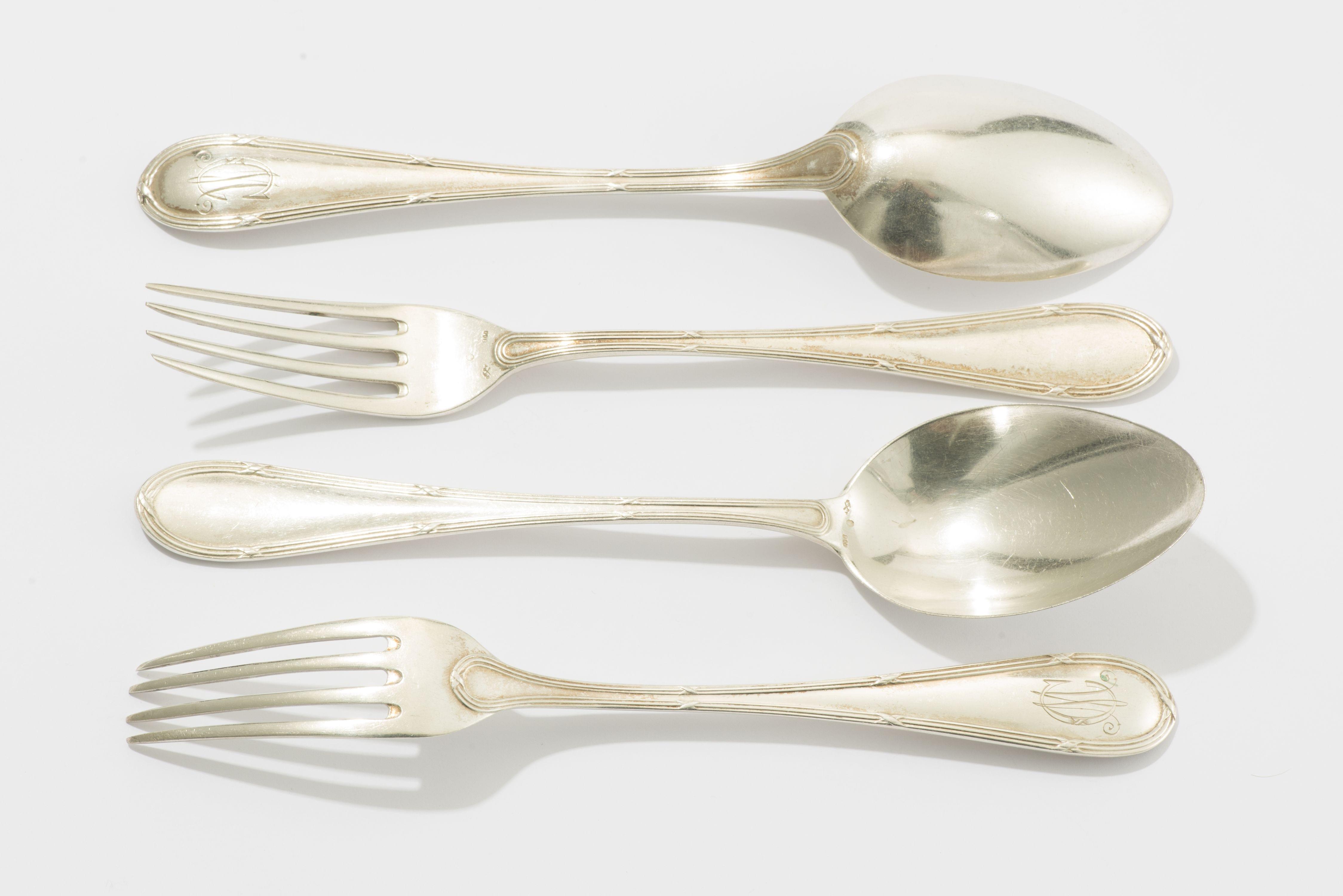 Jezler, argent 800, comprenant: 11 fourchettes, 10 cuillères et 11 couteaux de table, 11 cuillères à dessert, 10 fourchettes à pâtisserie, 15 pièces de service et 11 cuillères à café d'un modèle semblable de fabrication allemande, 2770g (79p)