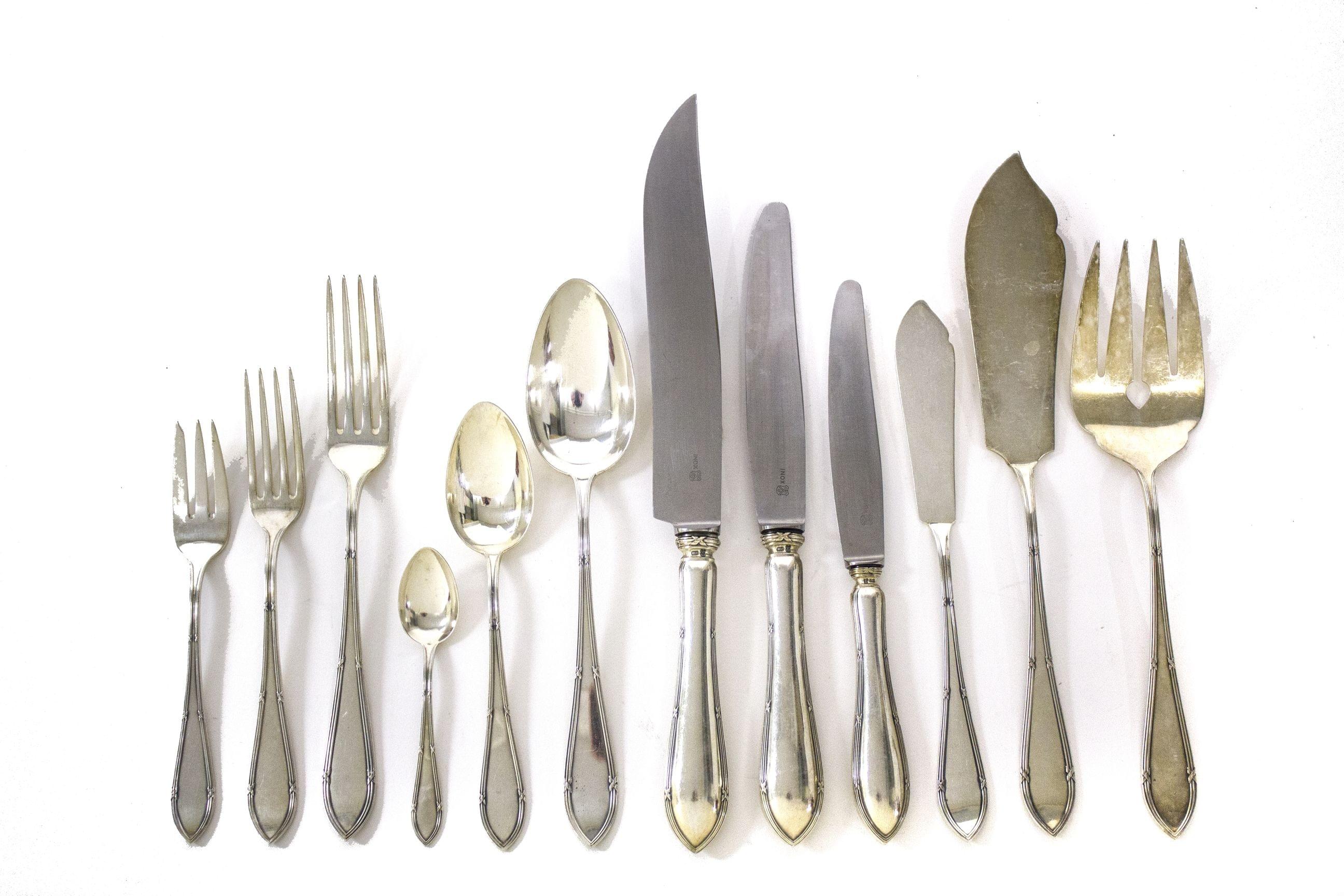 Argent 800, comprenant: 12 fourchettes, 12 couteaux et 6 cuillères à dîner, 12 fourchettes, 11 couteaux et 9 cuillères à entremets, 11 fourchettes et 12 couteaux à poisson, 9 fourchettes à pâtisserie, 12 cuillères à café et 14 pièces de service, 3500 g (120p)