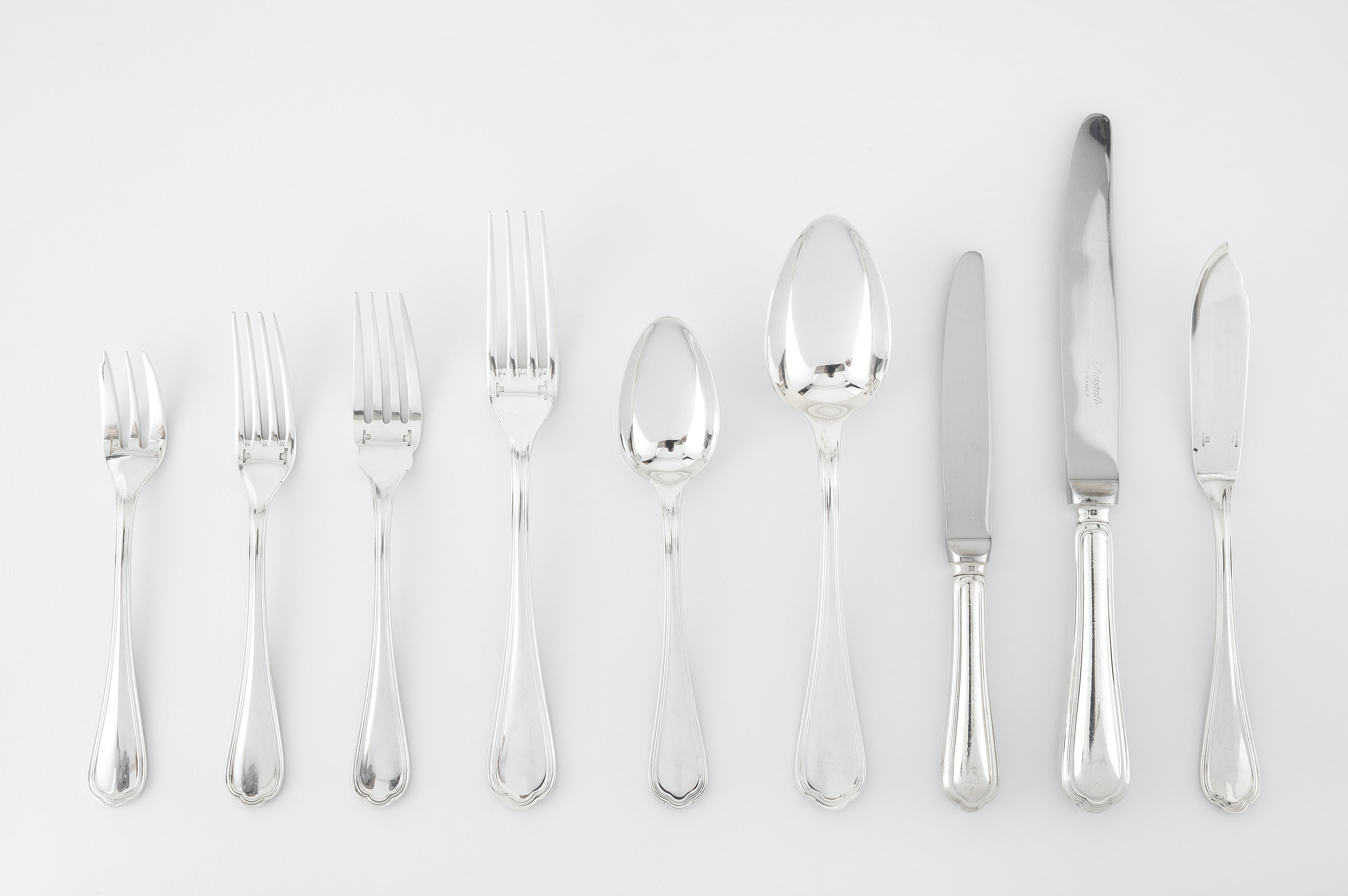 Christofle, métal argenté, comprenant: 12 fourchettes, 12 couteaux et 11 cuillères à dîner, 11 fourchettes, 12 couteaux et 11 cuillères à entremets, 12 fourchettes et 12 couteaux à poisson, 12 fourchettes à pâtisserie, 12 à huîtres, 12 cuillères à glace, 12 à beurre