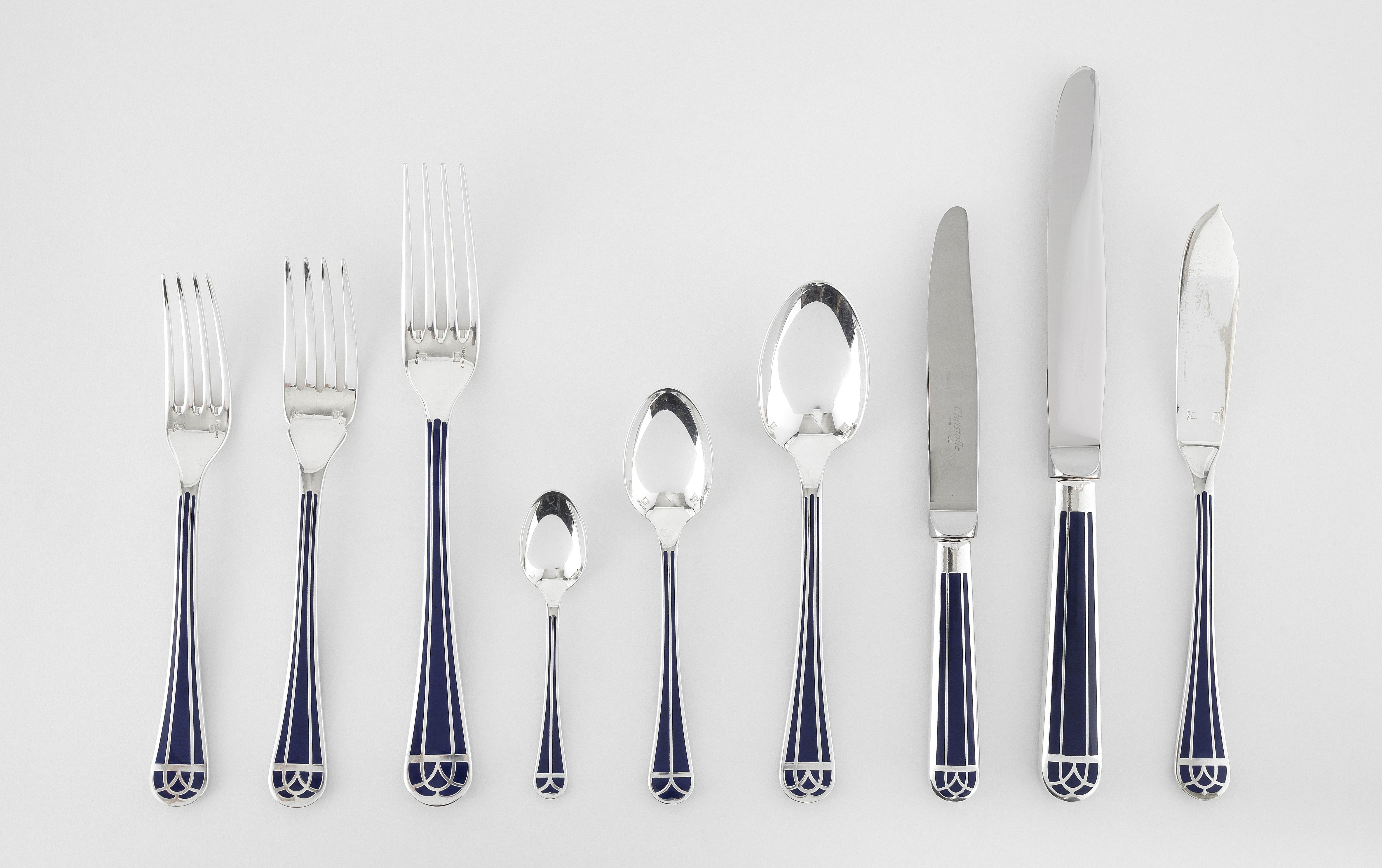 Christofle, métal argenté et laque de Chine bleue cloisonnée, comprenant: 12 fourchettes et 12 couteaux à dîner, 12 fourchettes, 12 cuillères et 12 couteaux à entremets, 12 fourchettes et 12 couteaux à poisson, 12 cuillères à thé, 12 à café, 12 couteaux à beurre
