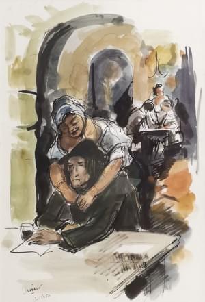 Scène de taverne, aquarelle et encre sur papier, 52x36 cm
