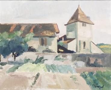 L'église et la ferme, Begnins, huile sur toile, signée, 81x65 cm