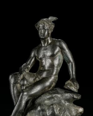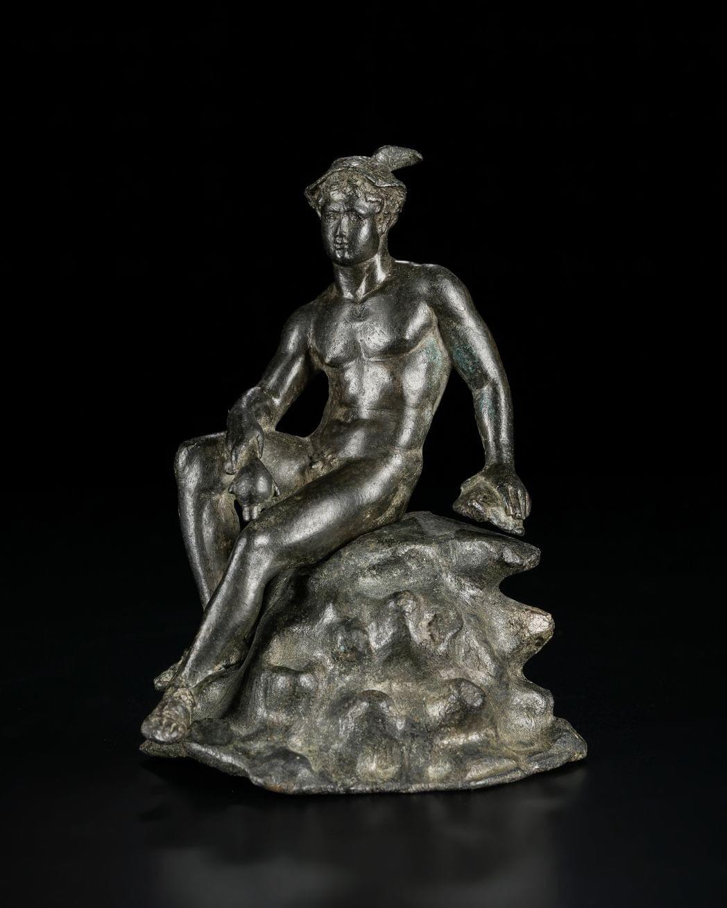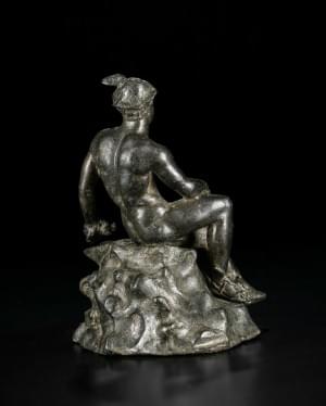 Bronze à patine verte, H 19,5 cm, Notre statuette reprend l'éffigie la plus connue du dieu messager dont la plus belle réalisation est due au sculpteur Lysippe et dont une copie romaine est conservée au musée archéologique de Naples. La particularité de notre exemplaire est qu'il est réalisé en deux parties et dénote une particulière habileté du sculpteur dans le rendu anatomique du dieu dissocé du rocher sur lequel il est assis. Provenance: Collection privée suisse