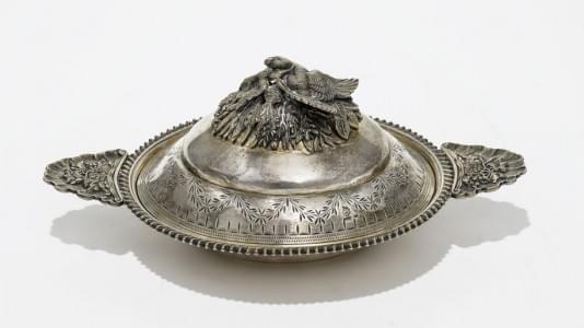 155. Ecuelle ovale couverte sur présentoir de style Louis XV à bordur...
