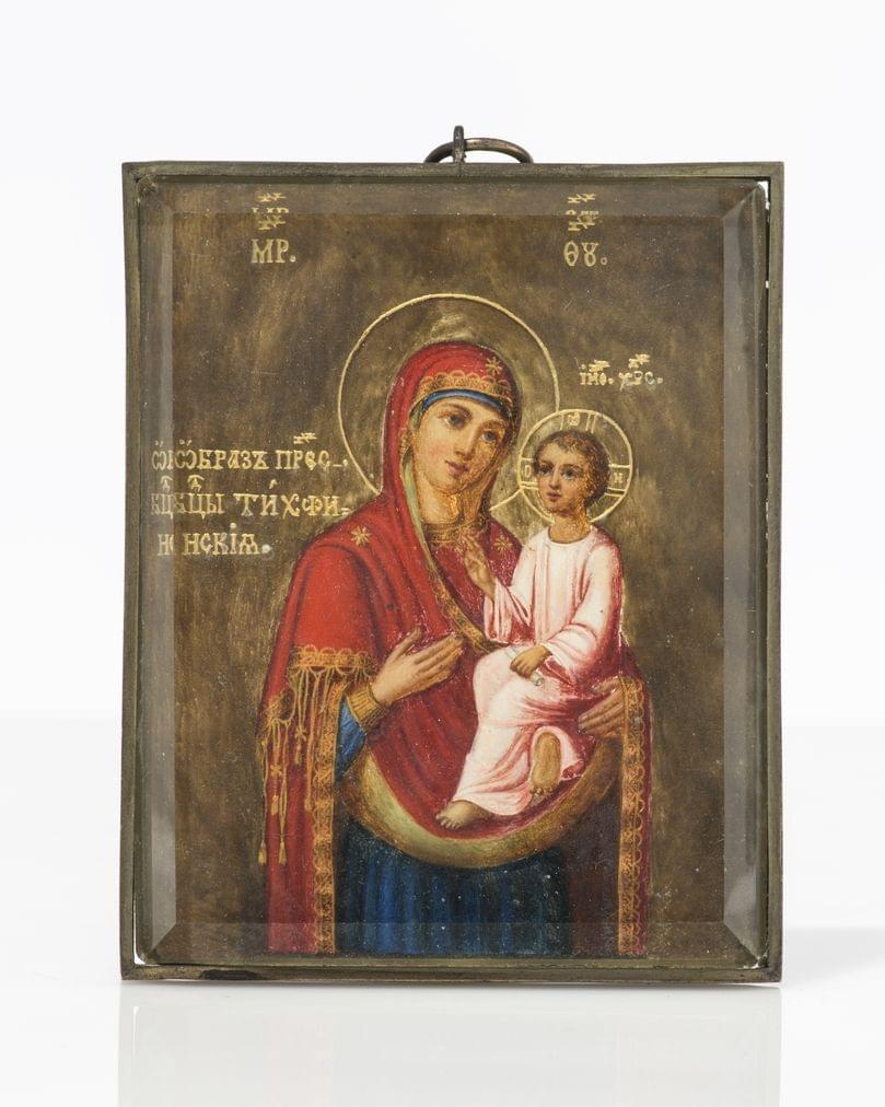 53. Mère de Dieu de Tichwin, icône sous verre recto verso, l'un des côtés dépouillé, l'autre décoré à l'or et portant l'inscription "Образ Прес[ятой] Б[огороди]цы Тихвинской", 9,5 x 7,5 cm