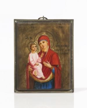 Mère de Dieu de Tichwin, icône sous verre recto verso, l'un des côtés dépouillé, l'autre décoré à l'or et portant l'inscription "Образ Прес[ятой] Б[огороди]цы Тихвинской", 9,5 x 7,5 cm