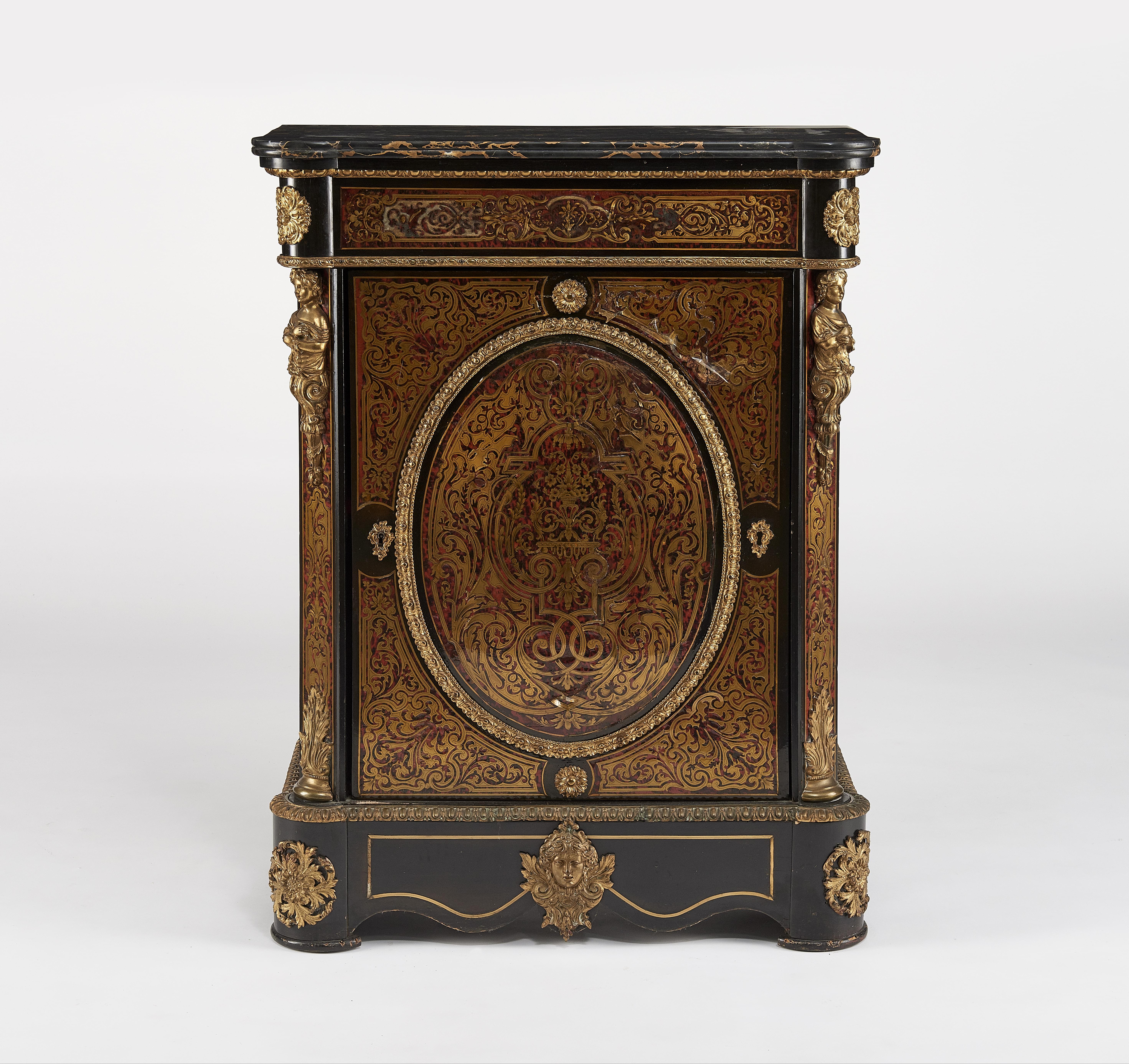Marqueterie de laiton, écaille et bois noirci, bronze doré, 111x83x40 cm