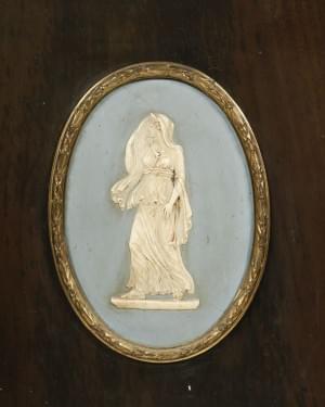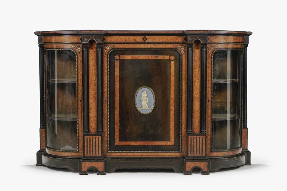 Deux vantaux vitrés et un central à décor d'un médaillon en biscuit, placage de bois de loupe et bois noirci, bronze doré, 105x169x46 cm