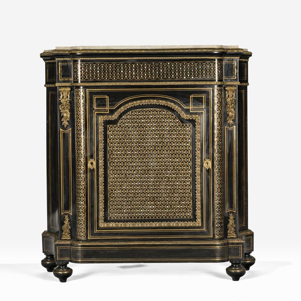 Un vantail, décor marqueté de nacre et filets de laiton, bois noirci, bronze doré et marbre blanc veiné gris, 107x102x42 cm