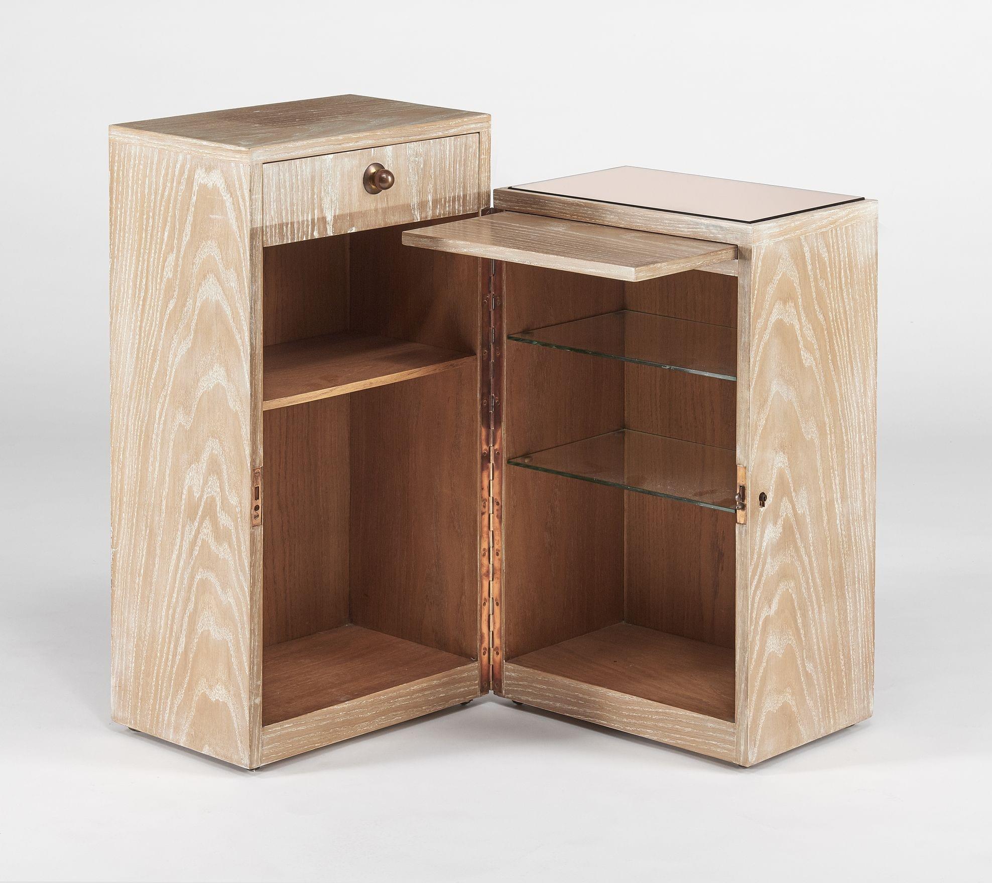 S'ouvrant en deux, démasquant casiers et tablette, un tiroir, dessus en miroir fumé, 76x40x59 cm