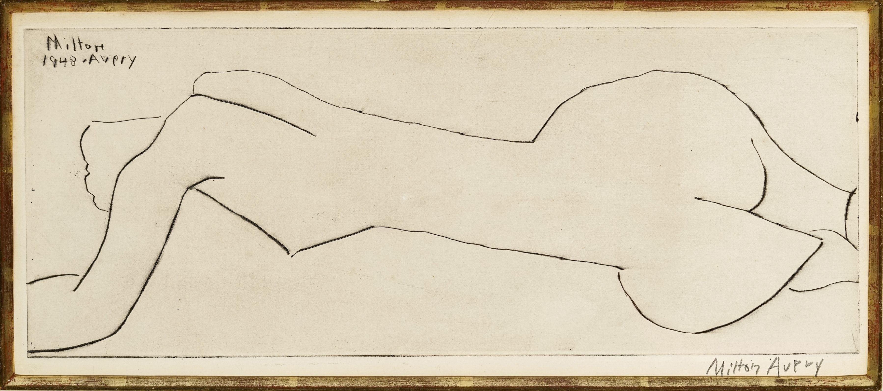 Nu féminin allongé, gravure signée et datée 1948 dans la planche, contre-signée à la mine de plomb, 18x39 cm. Provenance: Grace Borgenicht Gallery, New-York. Collection B. de Saussure
