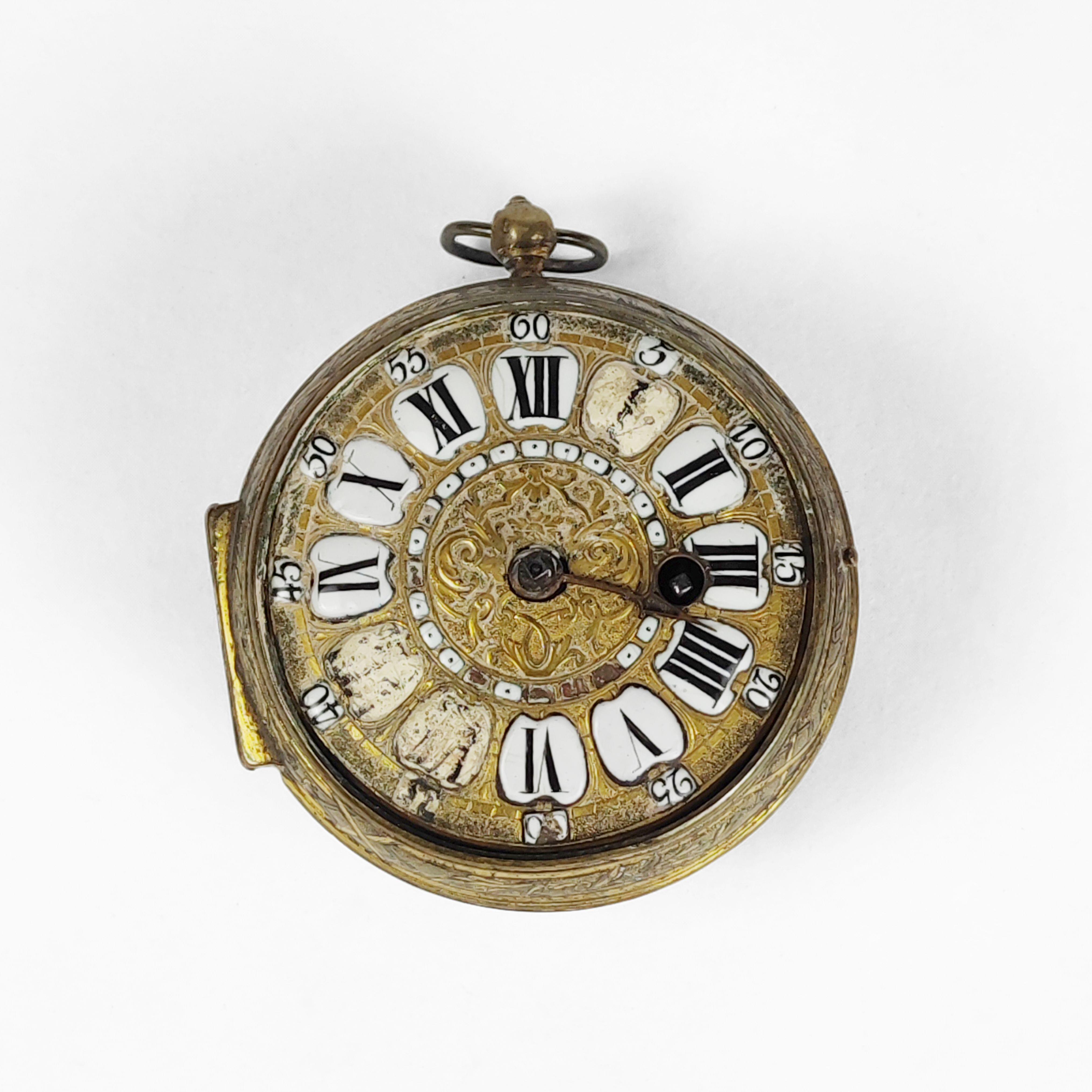 Cadran doré, aiguille en laiton, chiffres romains émaillés blancs, une partie du mécanisme détachée, boîtier à décor d'une scène de Diane et ses nymphes, D env 50 mm. Provenance: Collection en Suisse d'une famille franco-italienne.