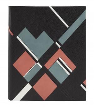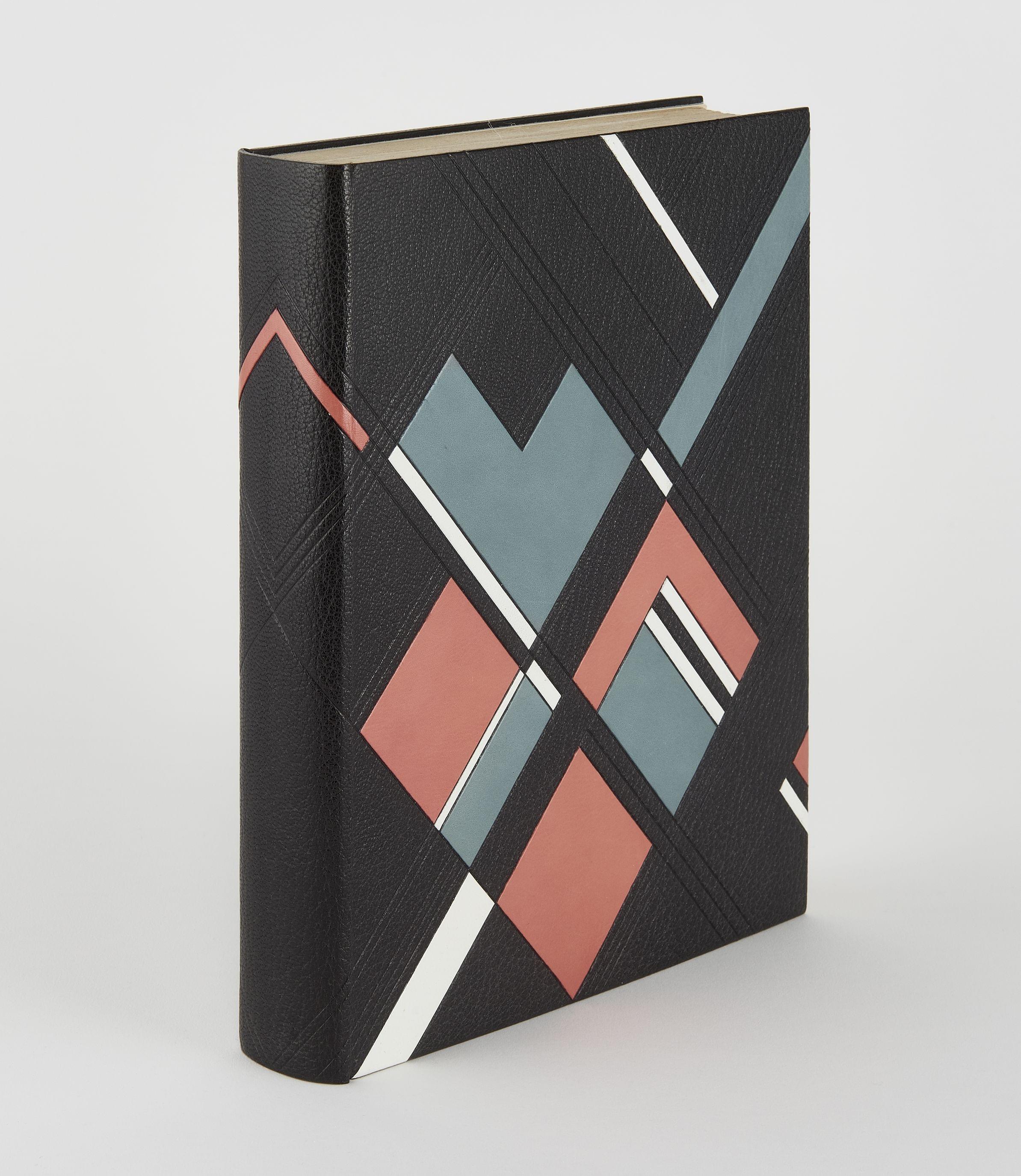 In 8°, mar. anthracite à décor de filets croisés estampés alternés avec des motifs géométriques de veau mos. de couleurs saumon, blanc et vert, gardes de daim gris, couv. sup. cons., coffret.