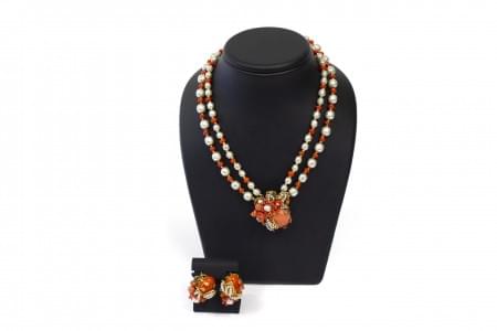 3211. Miriam Haskel, demi-parure comprenant un collier et une paire de clips d'oreilles sertis de perles et pierres rouges d'imitation