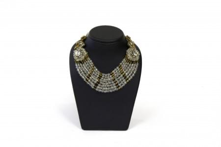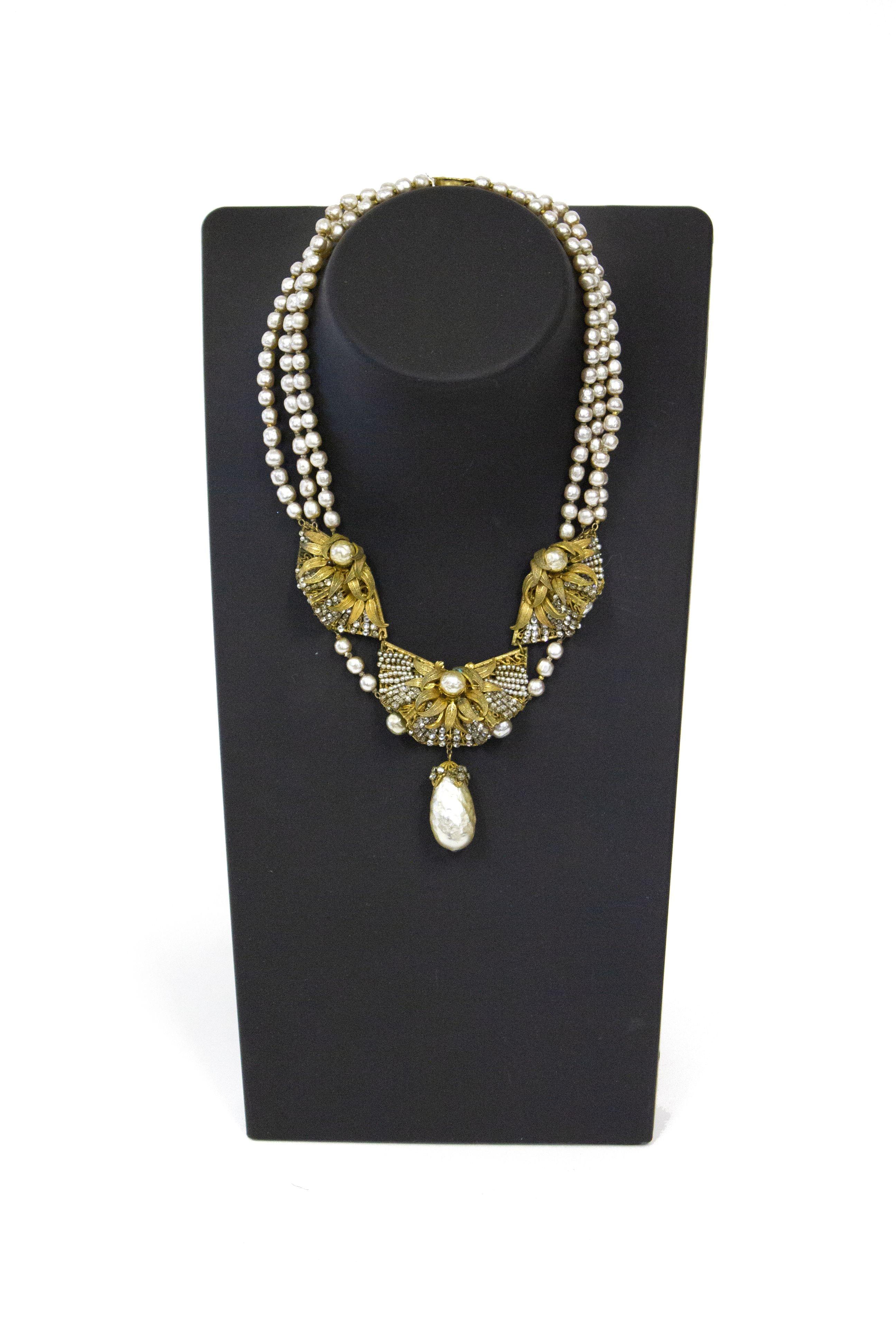3113. Miriam Haskel, lot de deux colliers de perles fantaisies, l'un à trois rangs retenant des motifs feuillagés sertis de pierres d'imitation et l'autre multi-rangs de perles de diverses tailles