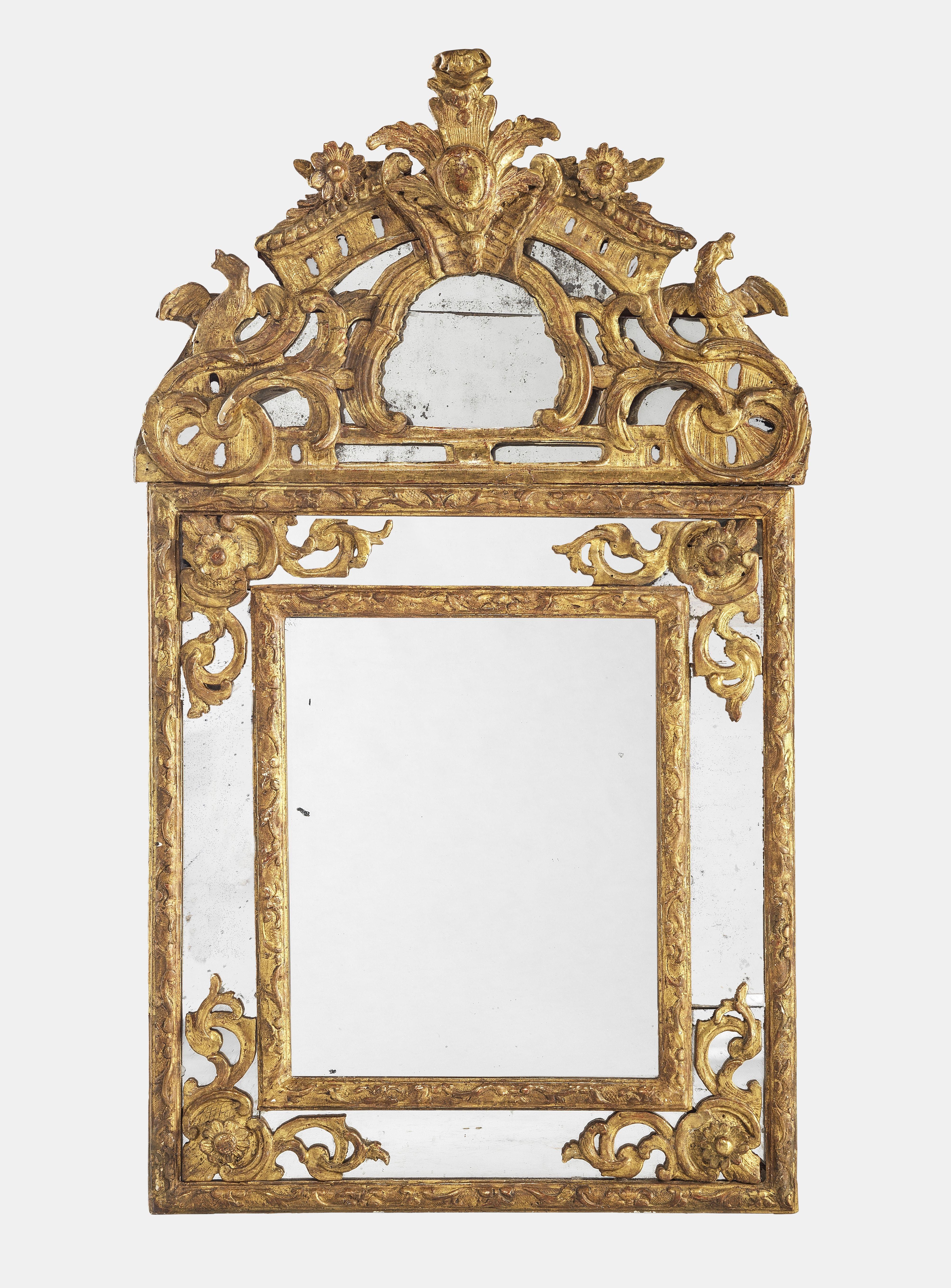 Bois sculpté doré et ajouré, à motif de fleurs et feuillage, glace au mercure, 100x58 cm
