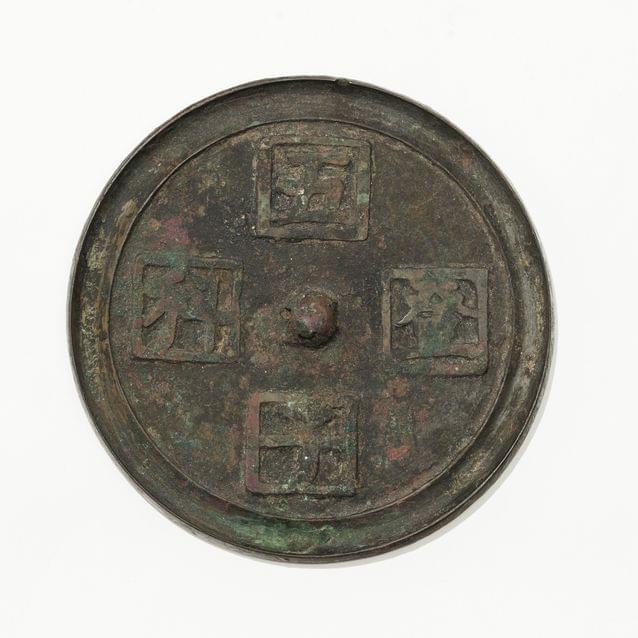 Bronze, à décor de quatre cachets figurant les caratères du chiffre 5 associé au yin et yang au dessus, de l'enfant en dessous, à droite celui de l'or souhaitant prospérité et à gauche la fleur de pêcher exprimant la longévité, D 13,5 cm