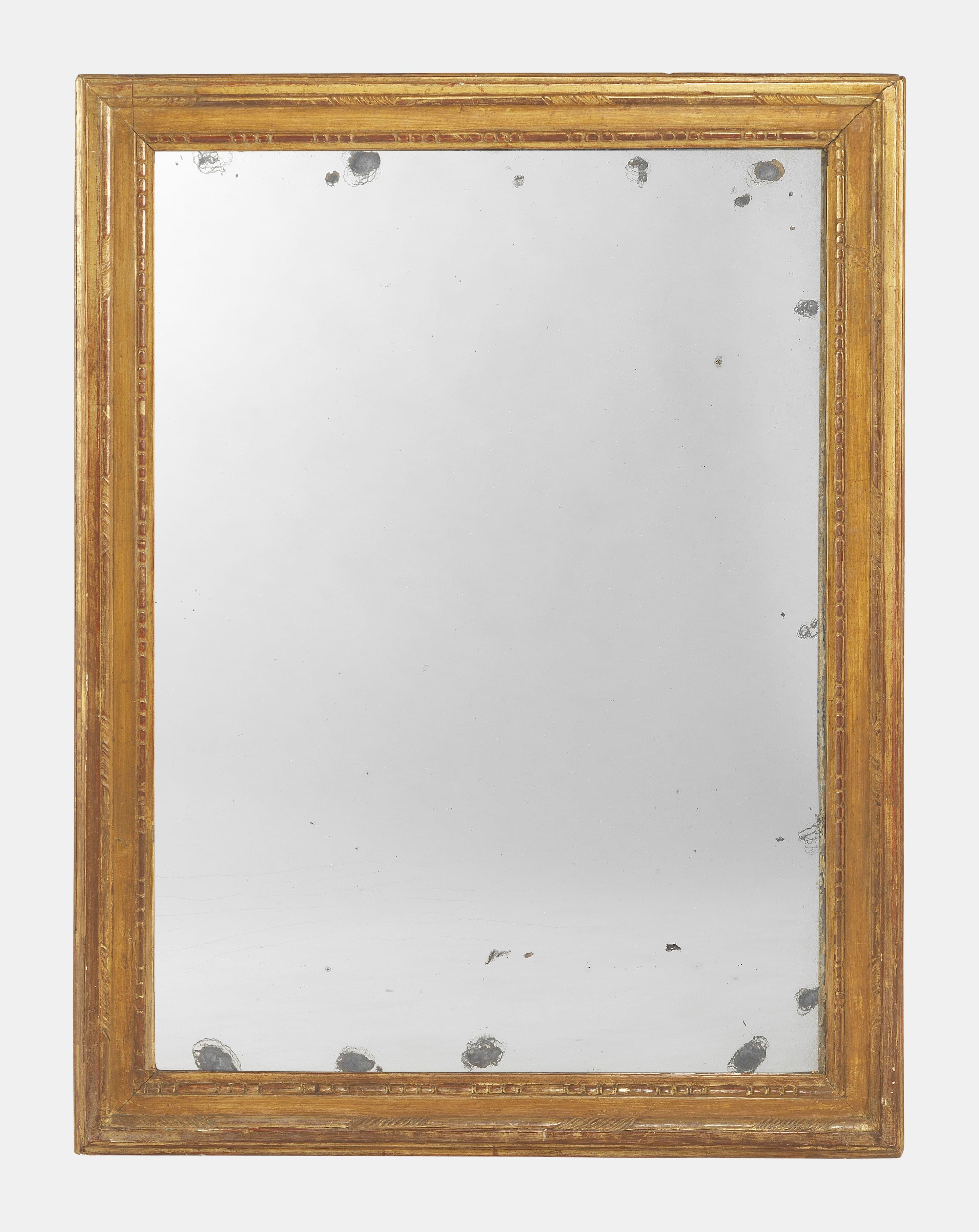 Bois sculpté et doré à motifs de frises de perles, glace au mercure, 72x57 cm