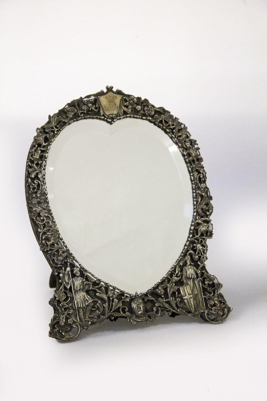 3287. Miroir de table d'époque victorienne à bordure ajourée de rinceaux et chevaliers