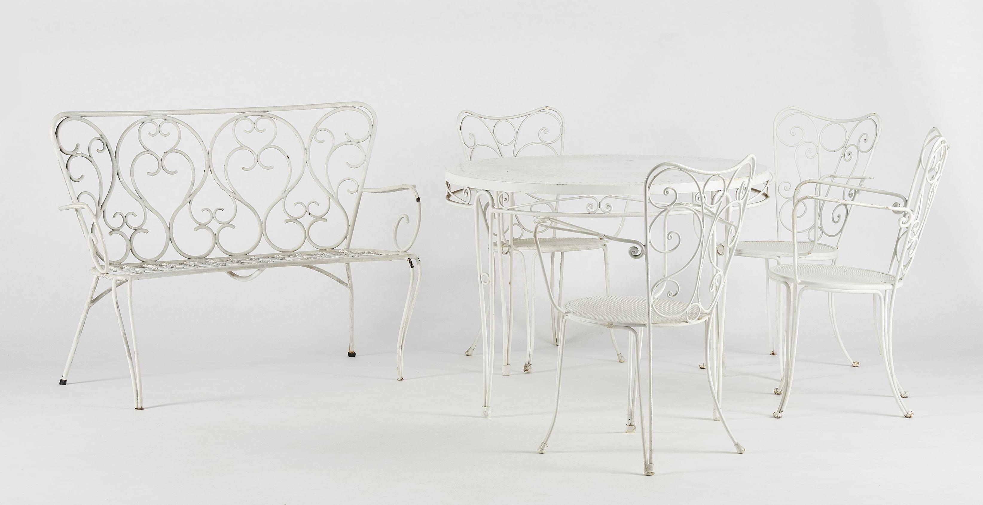 974. Mobilier de jardin comprenant une table, quatre fauteuils et une banquette