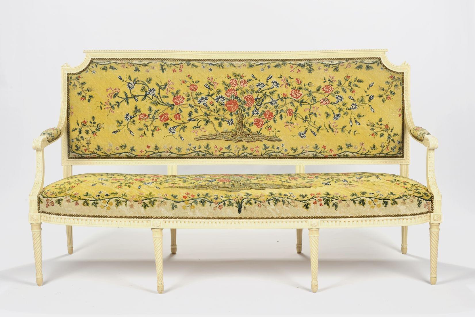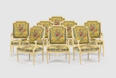 Comprenant un canapé et huit fauteuils, bois relaqué beige, XIXe s, garnis d'une tapisserie aux petits points d'époque Louis XVI