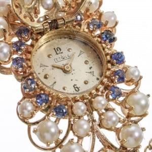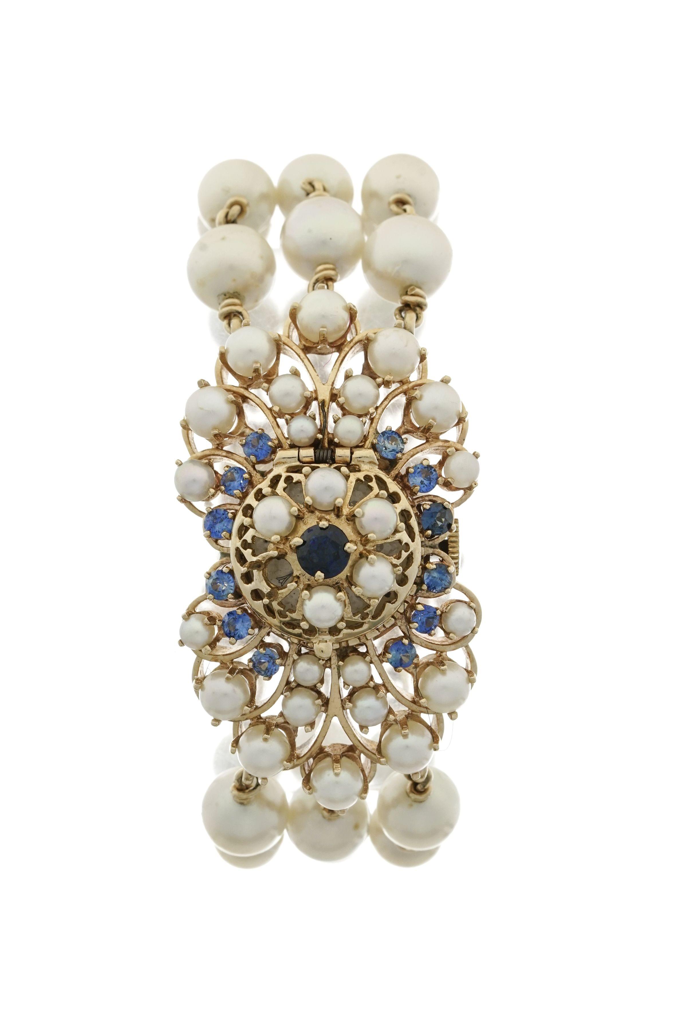 874. Montre bracelet à secret mécanique sertie de saphirs et de perles
