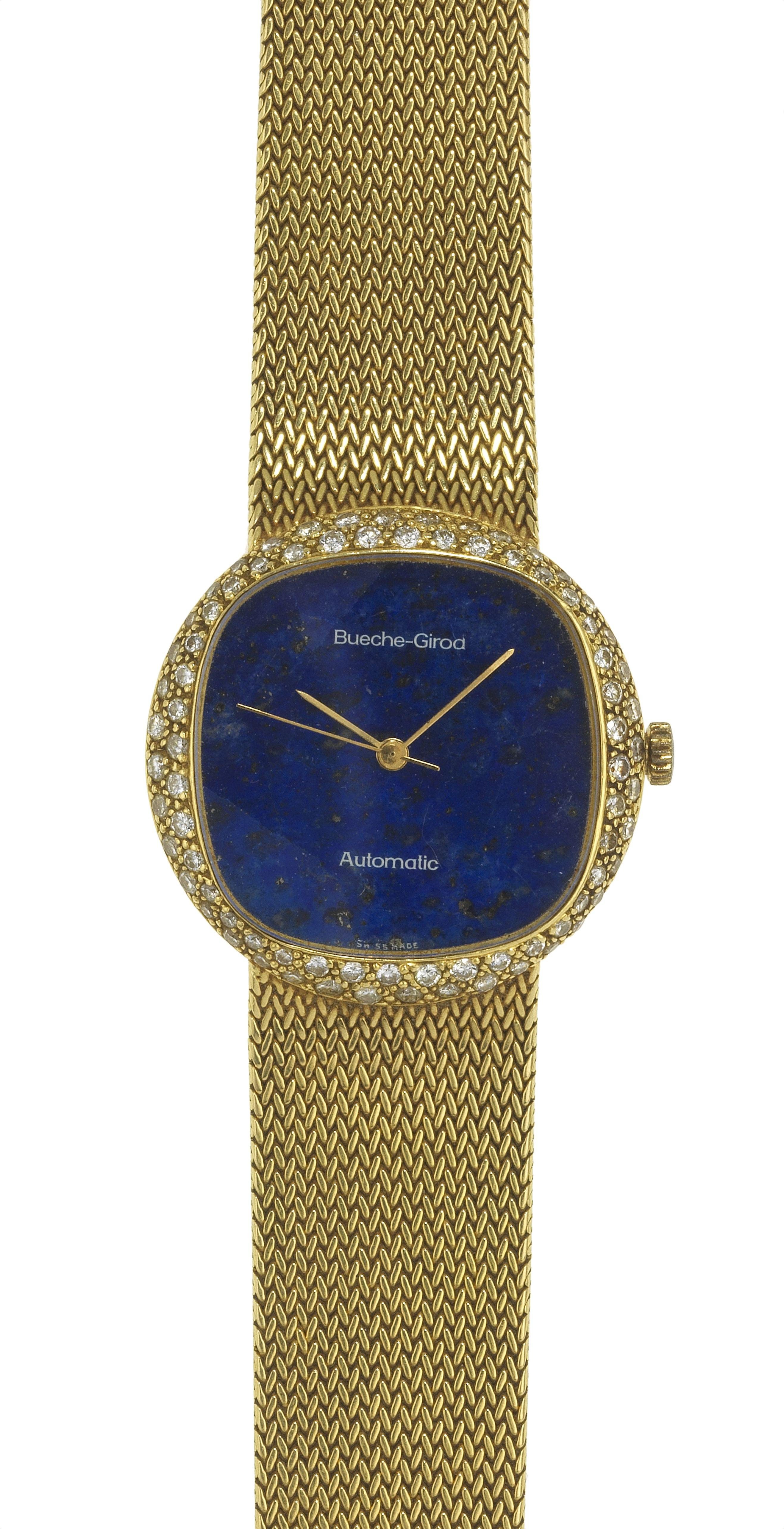 Cadran lapis-lazuli rapporté portant une signature Bueche-Girod, aiguilles dorées, or 750, poids brut 72 g, 30x30 mm