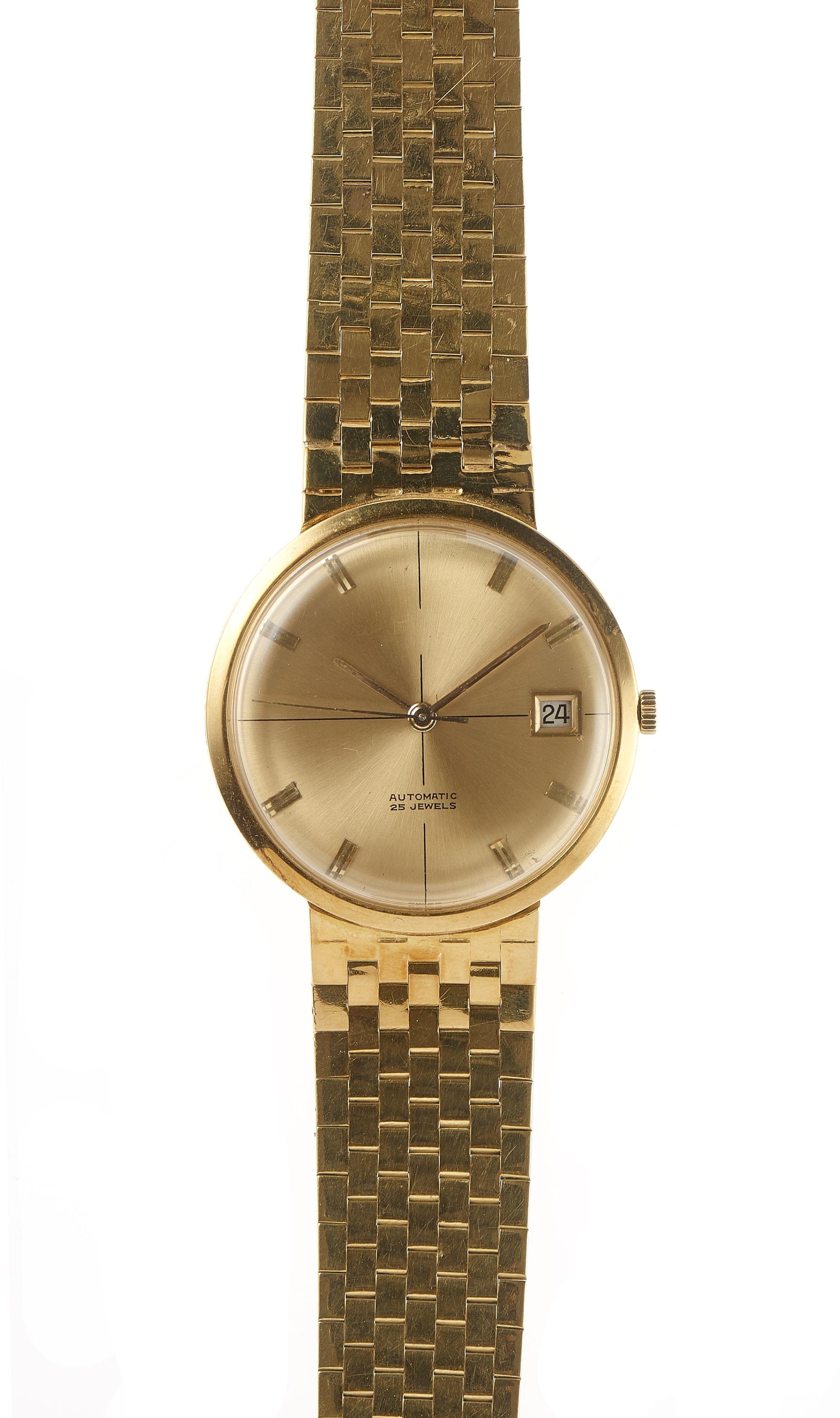 Cadran doré, aiguilles et index bâtons dorés, date à guichet à 3h, or 750, D 32 mm, poids brut 74 g
