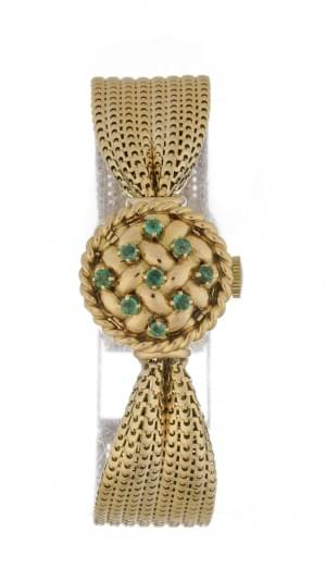 612. Montre bracelet ronde mécanique à secret sertie d'émeraudes
