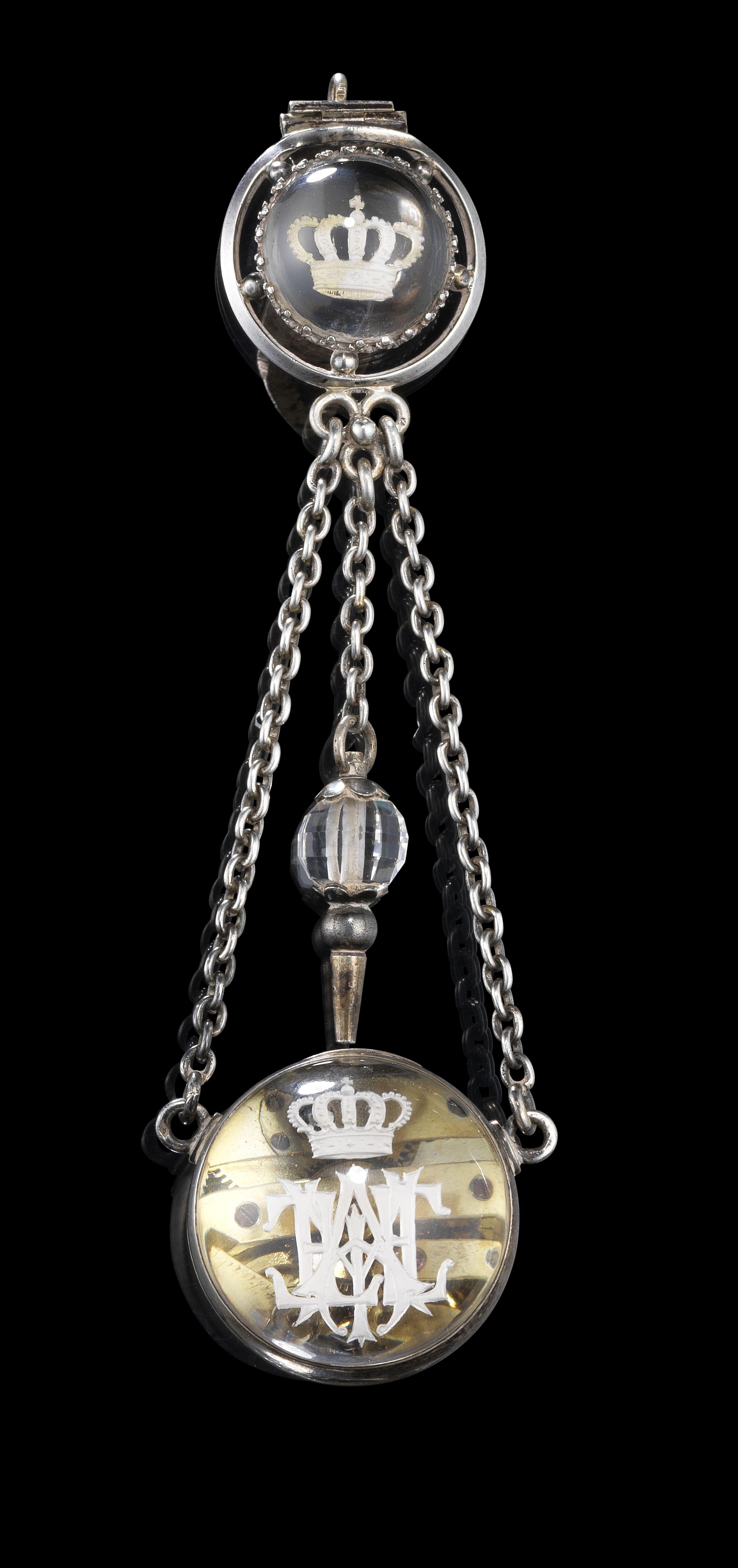 238. Montre châtelaine monogrammée composée de demi-boules de cristal de roche, ornée de la couronne d'archiduchesse et retenant sa clé