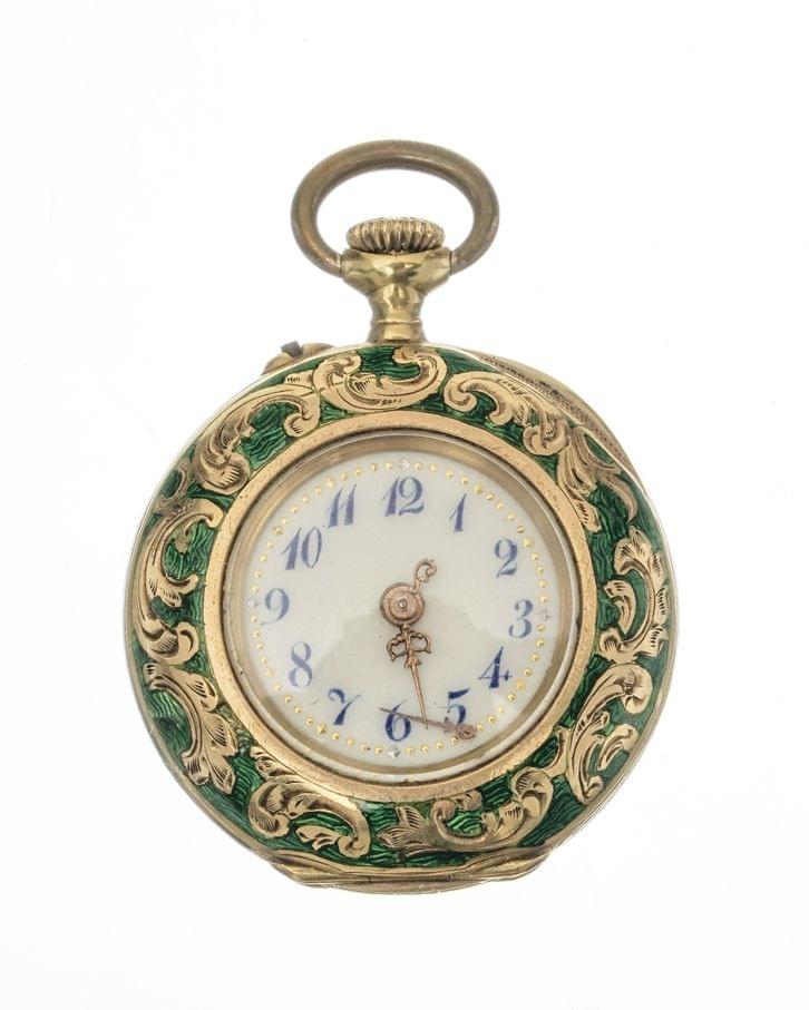 Cadran émaillé blanc, aiguilles dorées, chiffres romains et arab...