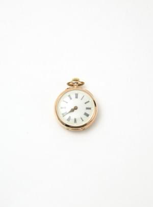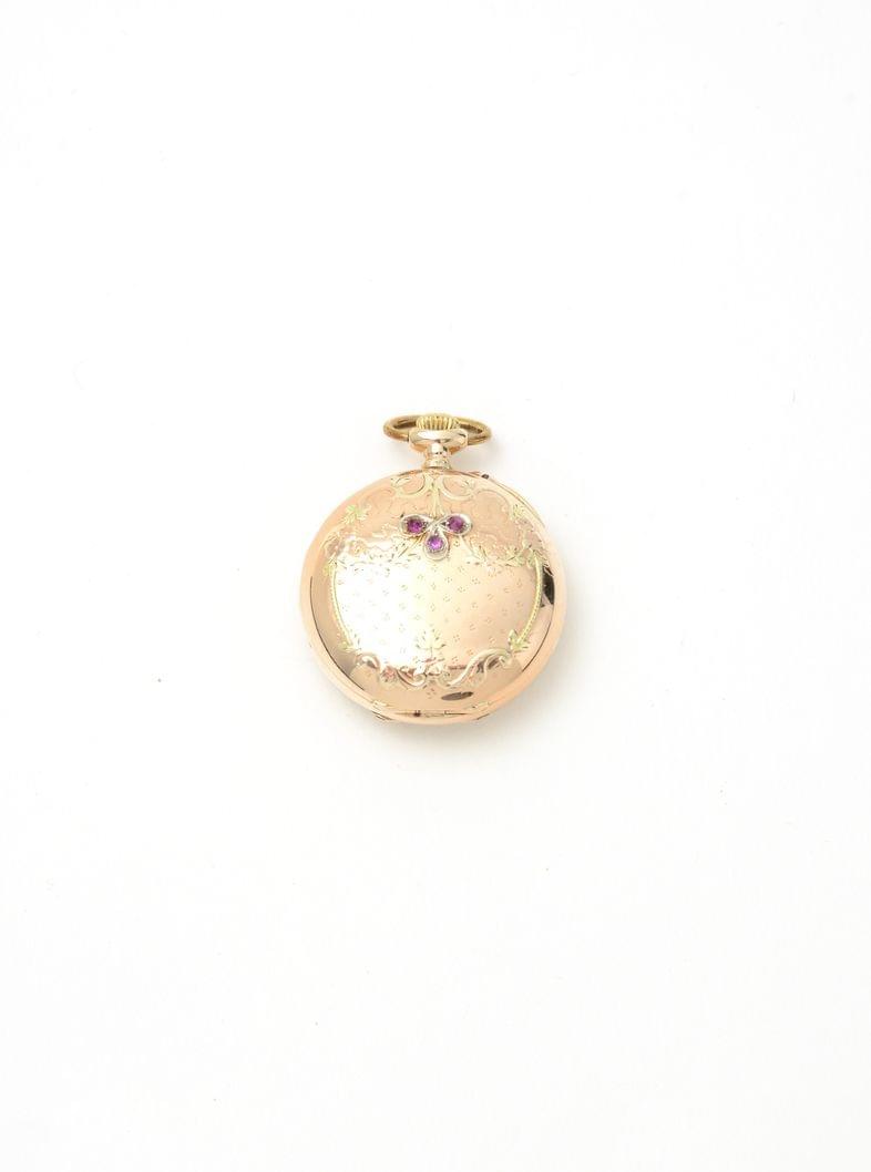 Cadran émaillé, aiguilles et index à points dorés, chiffres romains noirs, sertie de rubis au dos, or 750, D 25 mm, poids brut 14 g