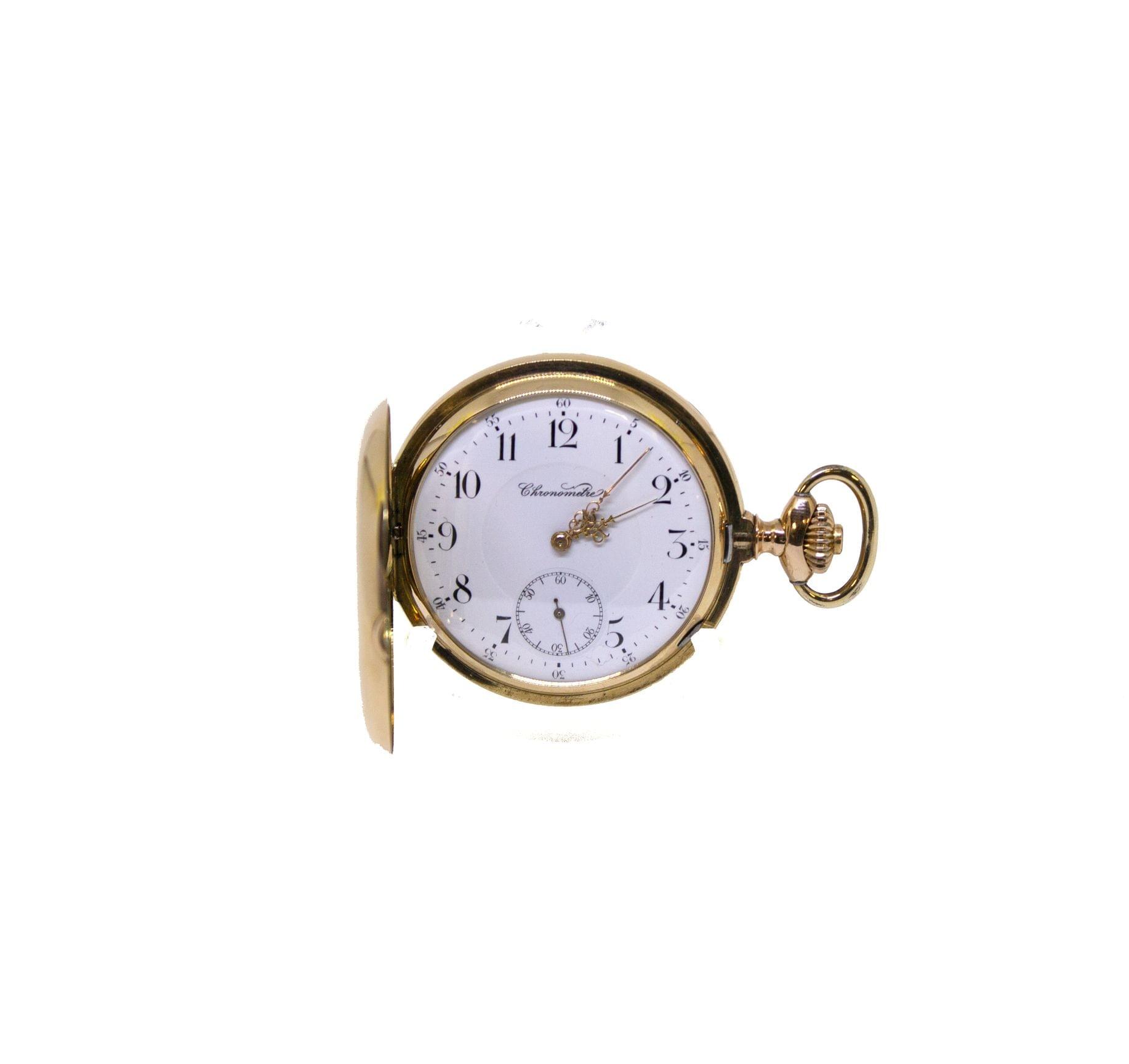 Cadran émaillé blanc, aiguilles dorées, chiffres arabes noirs, secondes à 6h, circa 1895, or 585, D 54 mm, poids brut 122 g