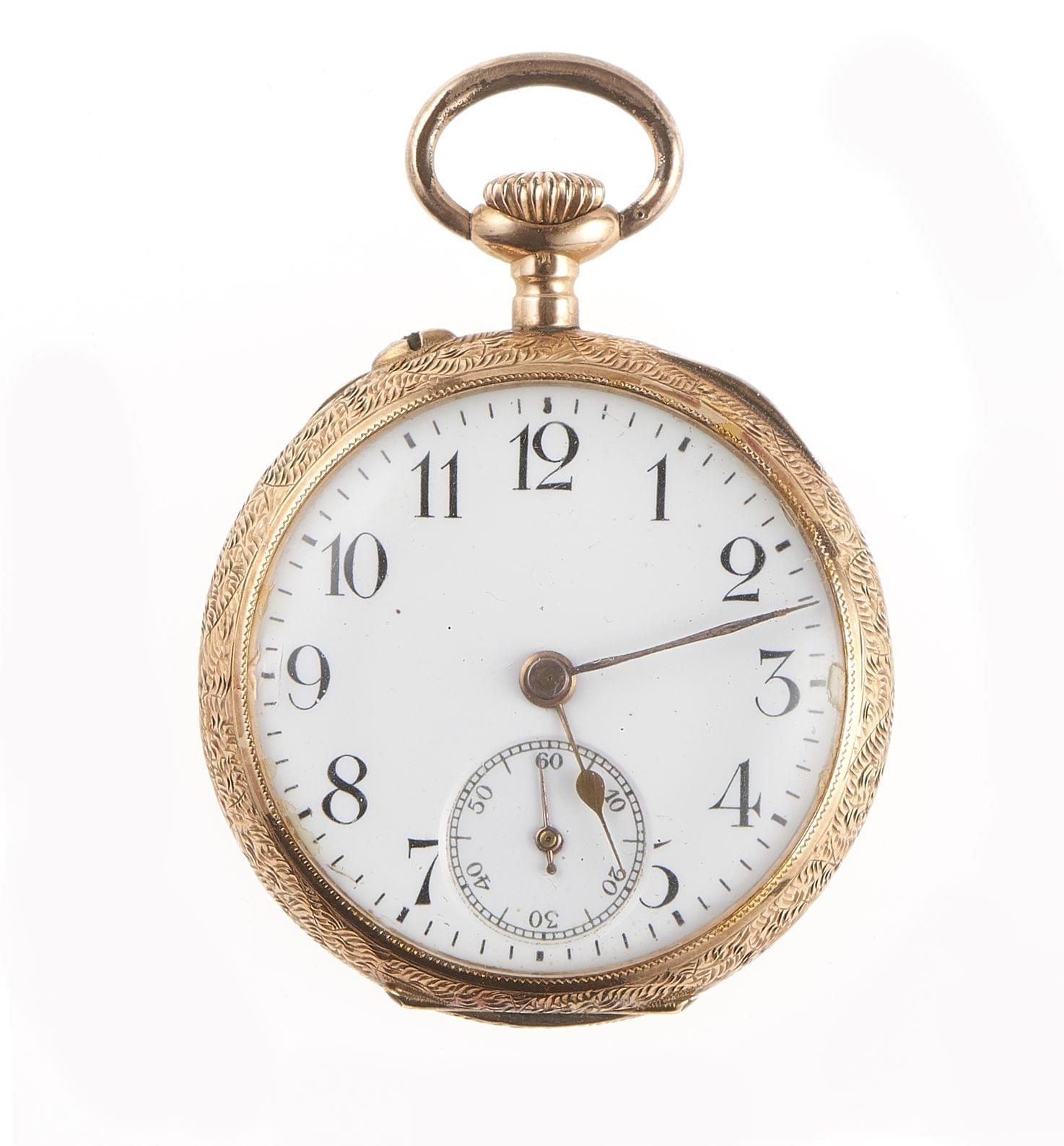 Cadran émaillé blanc, aiguilles dorées, chiffres arabes noirs, secondes à 6h, or 585, D 30 mm, poids brut 23 g