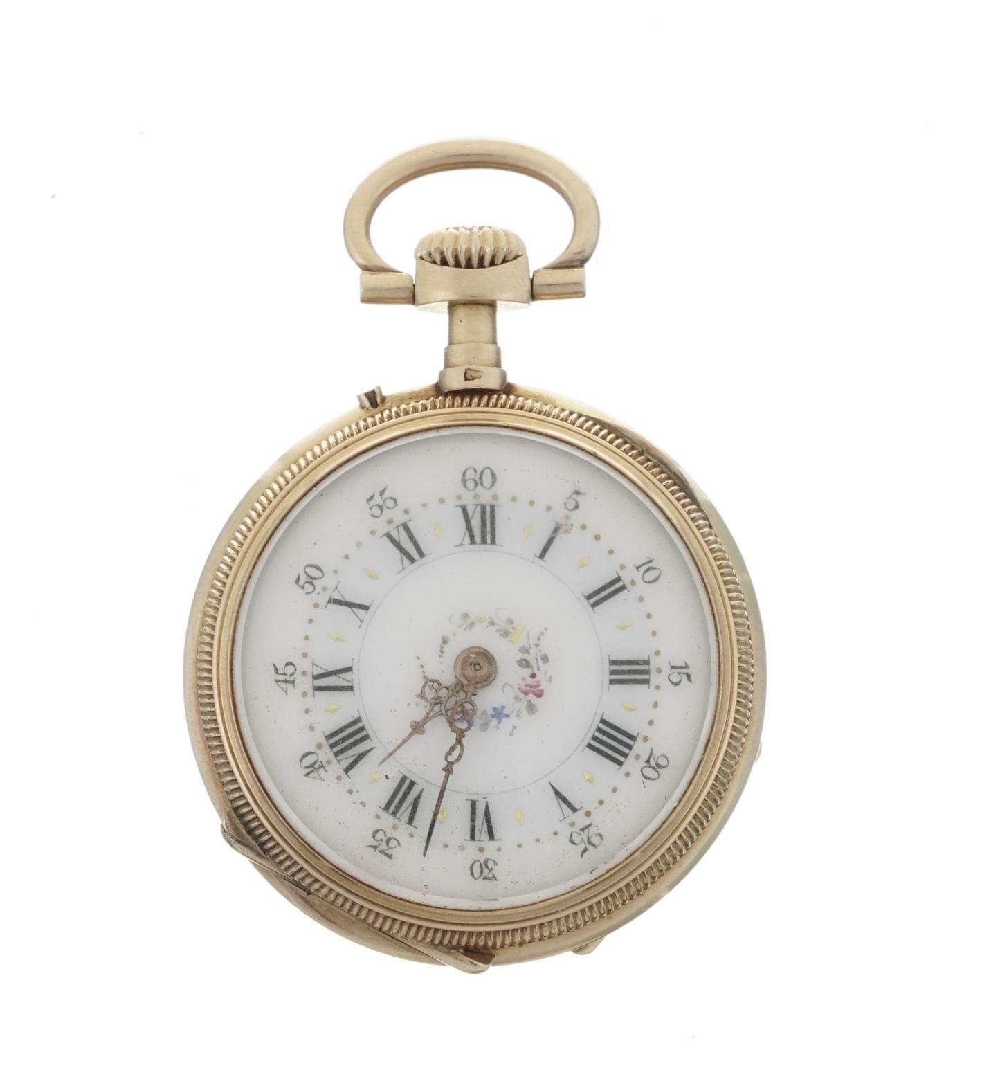 Cadran blanc émaillé de fleurs, aiguilles dorées, chiffres romains et arabes noirs, boîtier en or 750, D 34 mm, poids brut 30 g