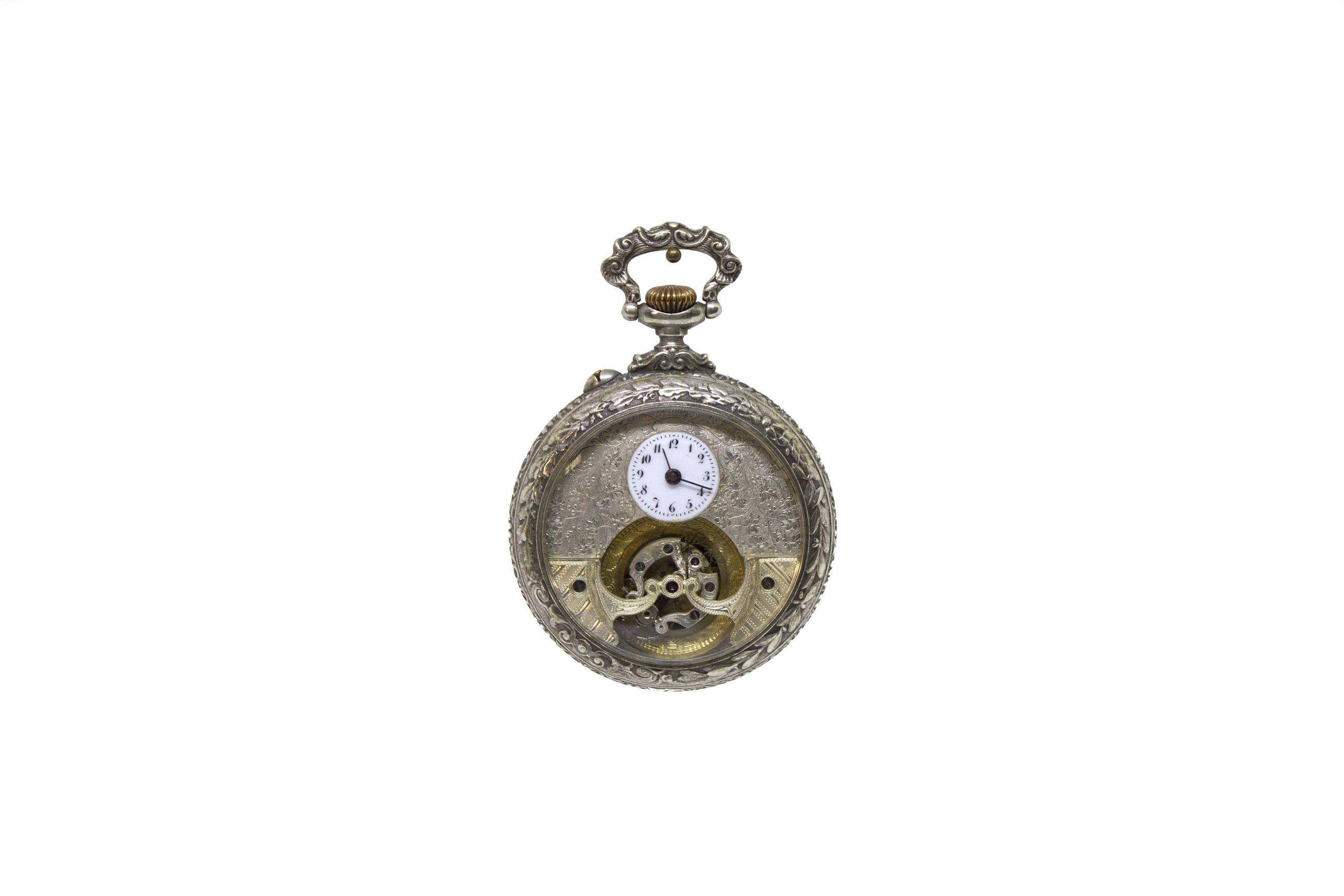 3087. Montre de poche à échappement visible de type carrousel à décor gravé de fleurs signé Frainier