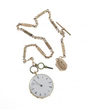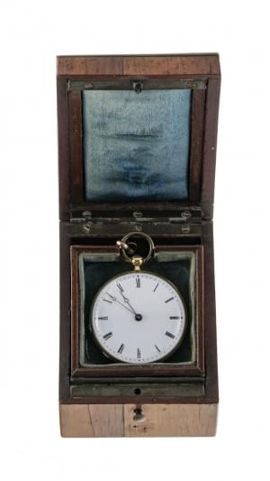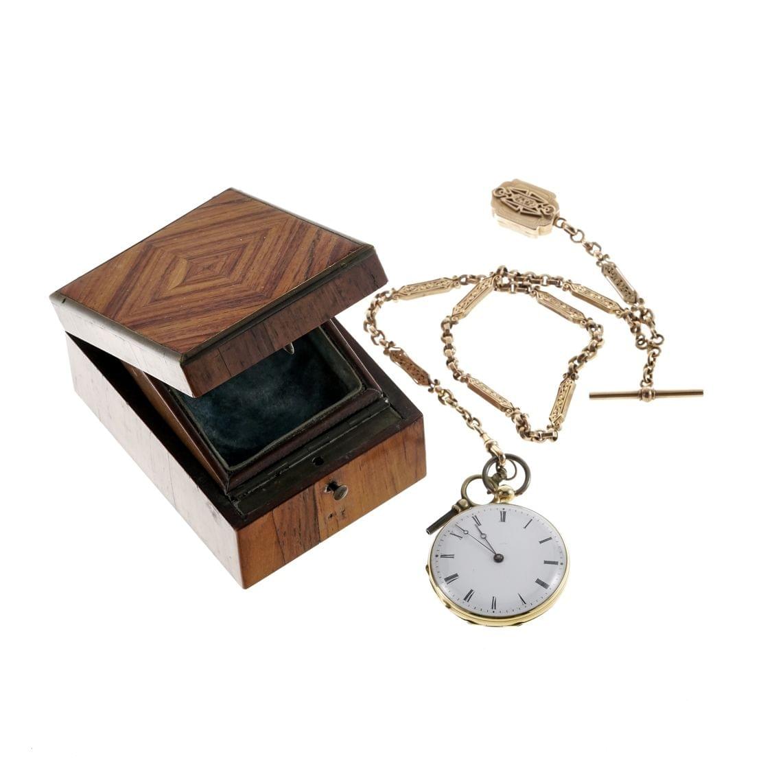 Cadran blanc, chiffres romains bleus, aiguilles noires, travail ancien, or 750, anneau en laiton, D 40 mm, poids brut 39 g, dans son écrin XIXème et avec sa clé. Un joint une chaîne de montre retenant un pendentif porte-photo en or rose 750, L 41 cm, poids brut 23 g. Provenance: Château fribourgeois