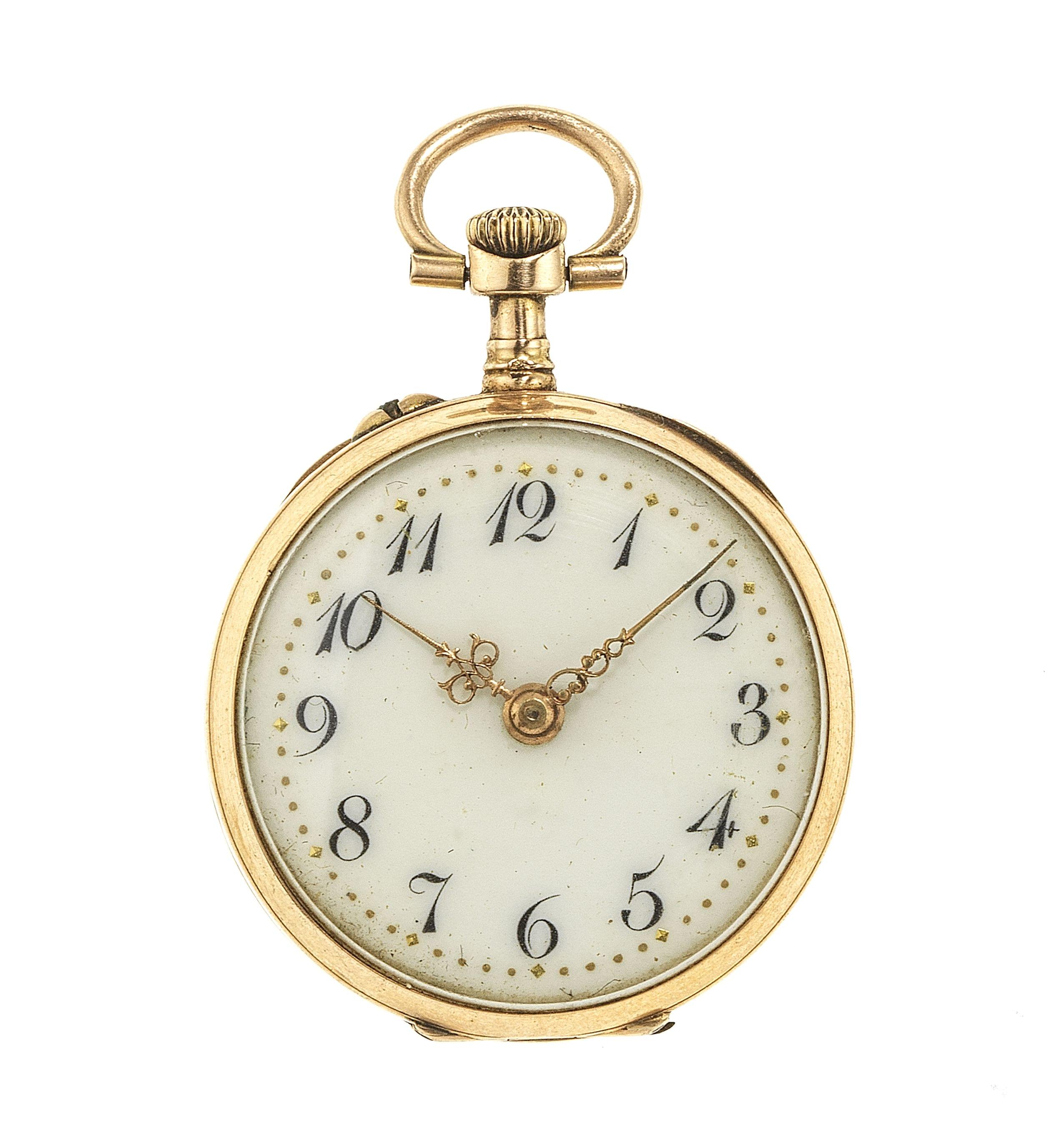 Cadran crème, aiguilles dorées, chiffres arabes noirs, travail français XIXè s, or 750, D 24 mm, poids brut 14 g