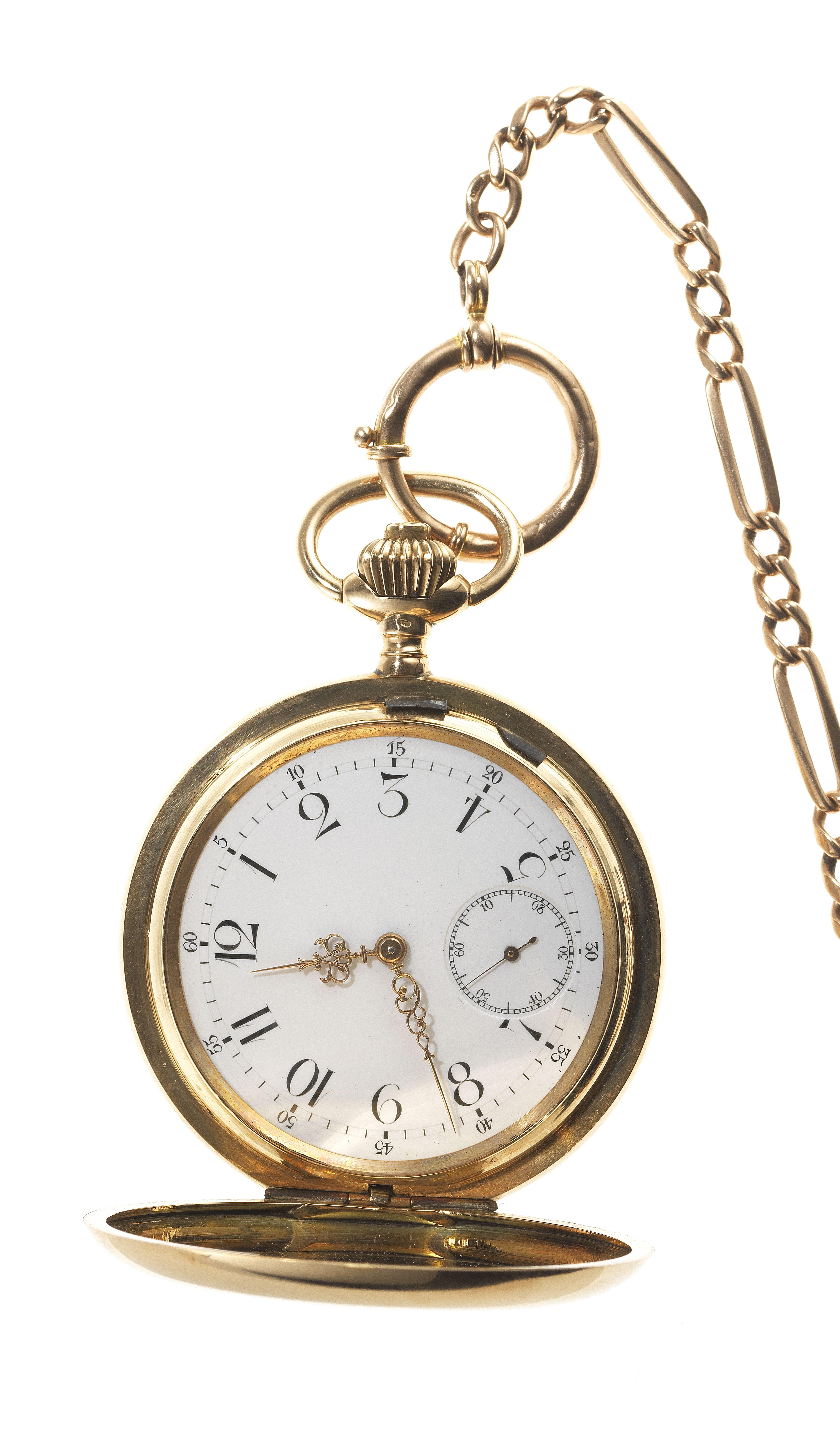 Cadran blanc, aiguilles dorées, chiffres arabes noirs, secondes à 6h, or 585, Hongrie, D 48 mm, poids brut 97 g. On joint une chaîne de montre. Or 585 et métal, 19 g