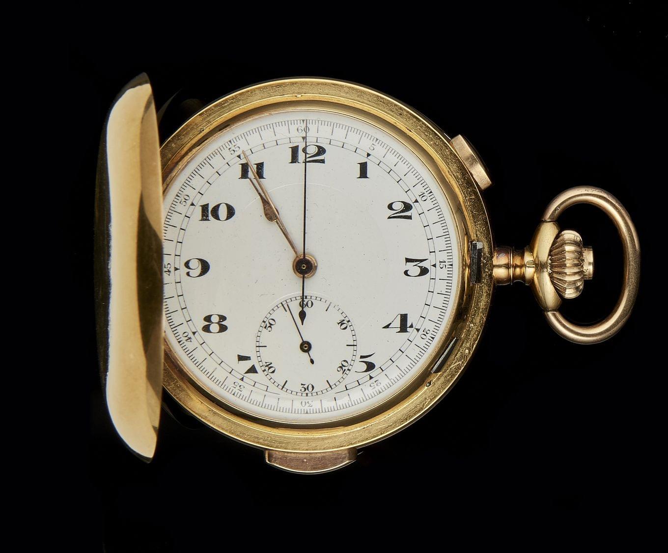 Cadran émaillé blanc, aiguilles dorées, chiffres arabes noirs, secondes à 6h, or 750, D env. 52 mm, poids brut 98 g